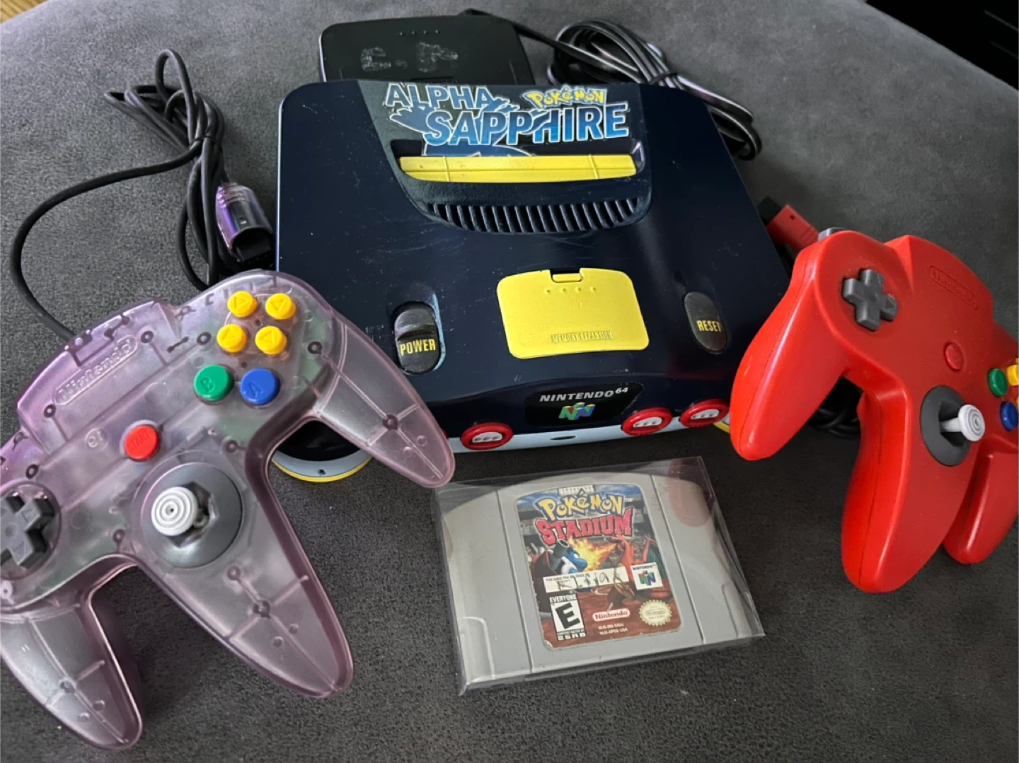 38Selling a Nintendo 64 console with a custom Alpha Sapphire design! Includes two controllers (one clear purple, one red) and the game Pokemon Stadium. Ready for some retro gaming fun