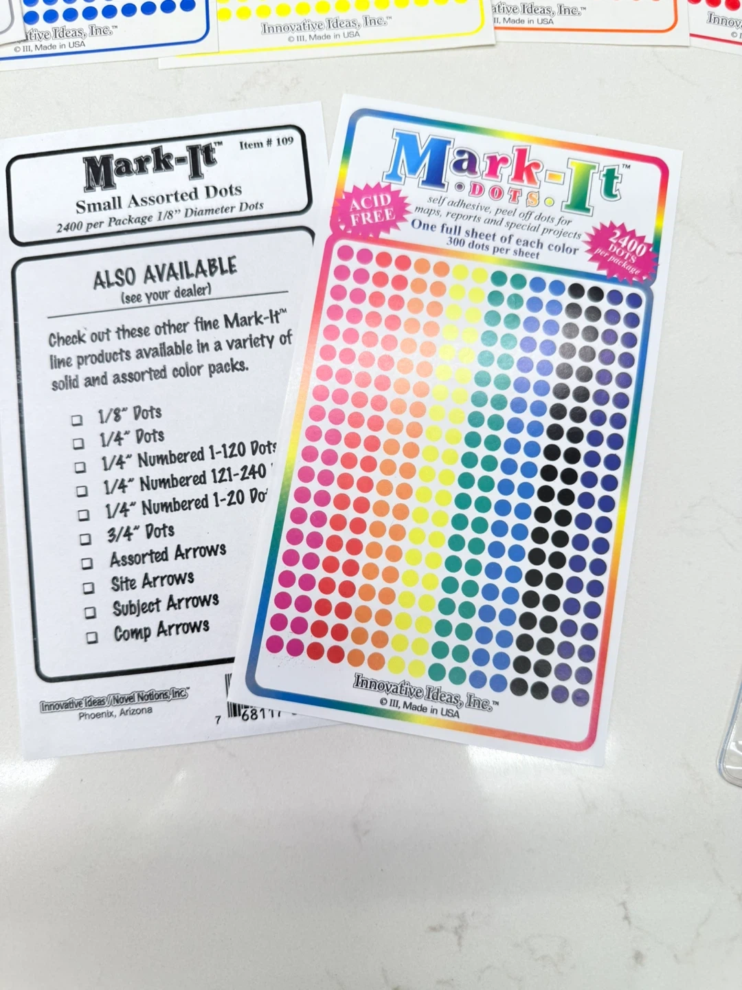 1000+I'm selling assorted packs of Mark-It Dots! These are self-adhesive, peel-off markers perfect for maps, reports, and special projects. Each pack contains 2400 dots per sheet, with 1/8" diameter dots. Available in a variety of solid and assorted color packs. Missing 1 color a couple columns only- see last images.