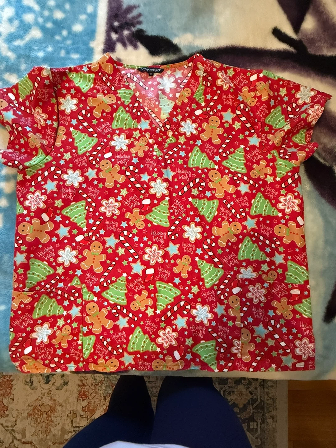 65I'm selling a WonderWink O scrub top with a fun holiday treats pattern. It features gingerbread men, Christmas trees, candy canes, and snowflakes on a red background. It’s perfect for the holiday season! They are size 2 XL I’m selling them $7 or 2 for $15