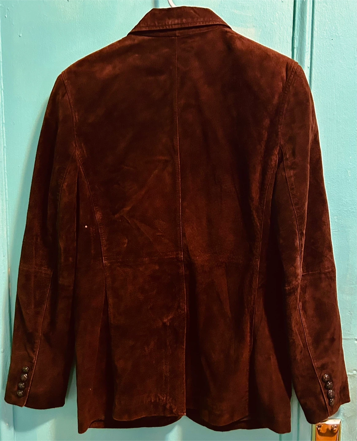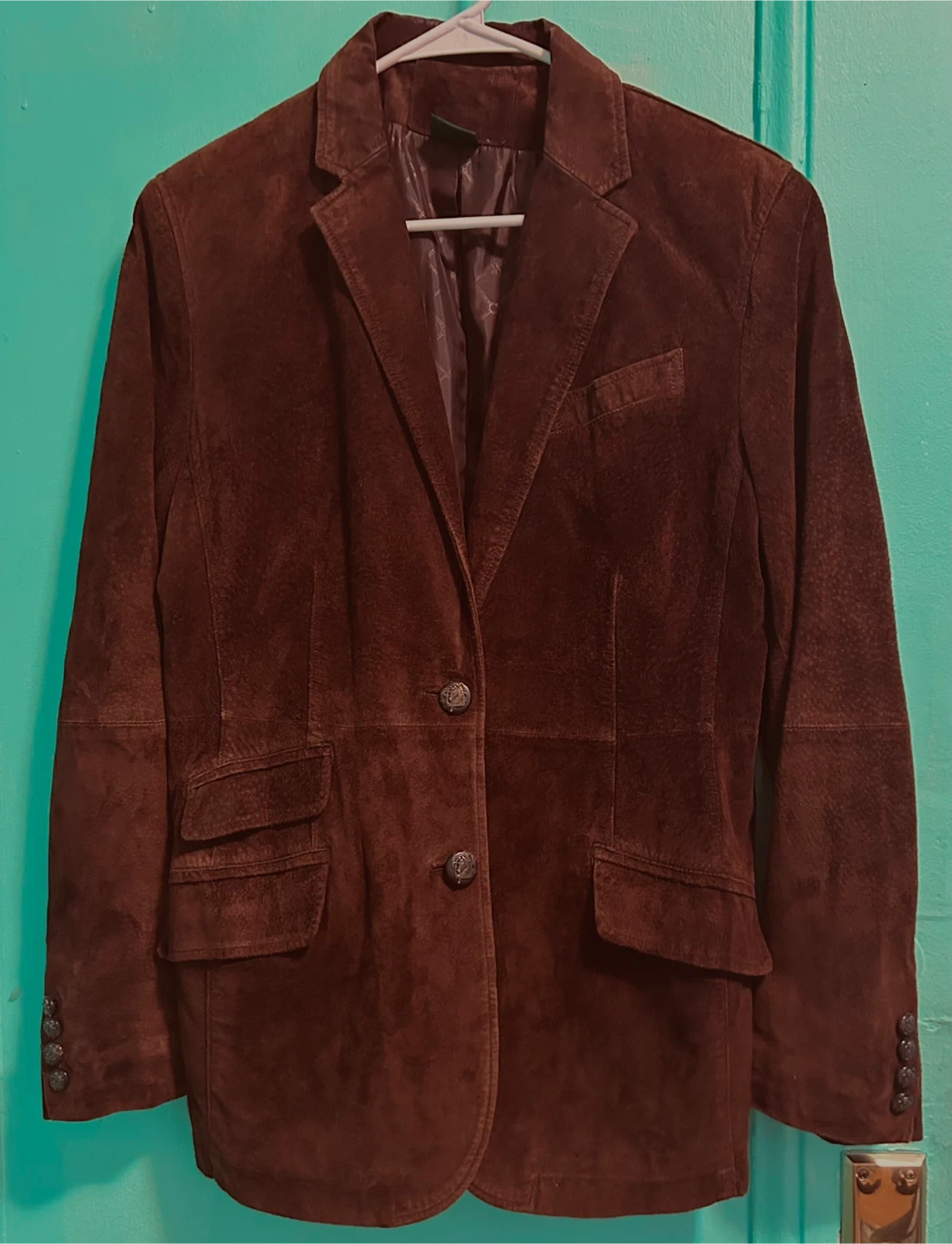 Here's a stylish brown suede blazer jacket! It's in great condition and ready for a new home. The material is soft and comfortable, perfect for adding a touch of class to any outfit. Feel free to ask any questions!