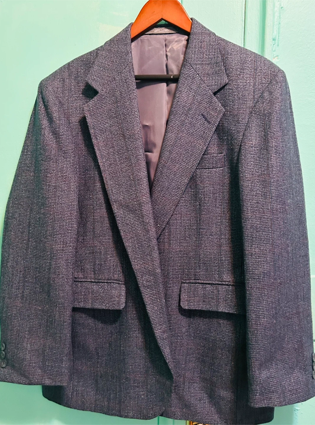 Selling a men's blazer. It's in great condition and ready for a new home! The blazer features a classic design with a textured pattern.