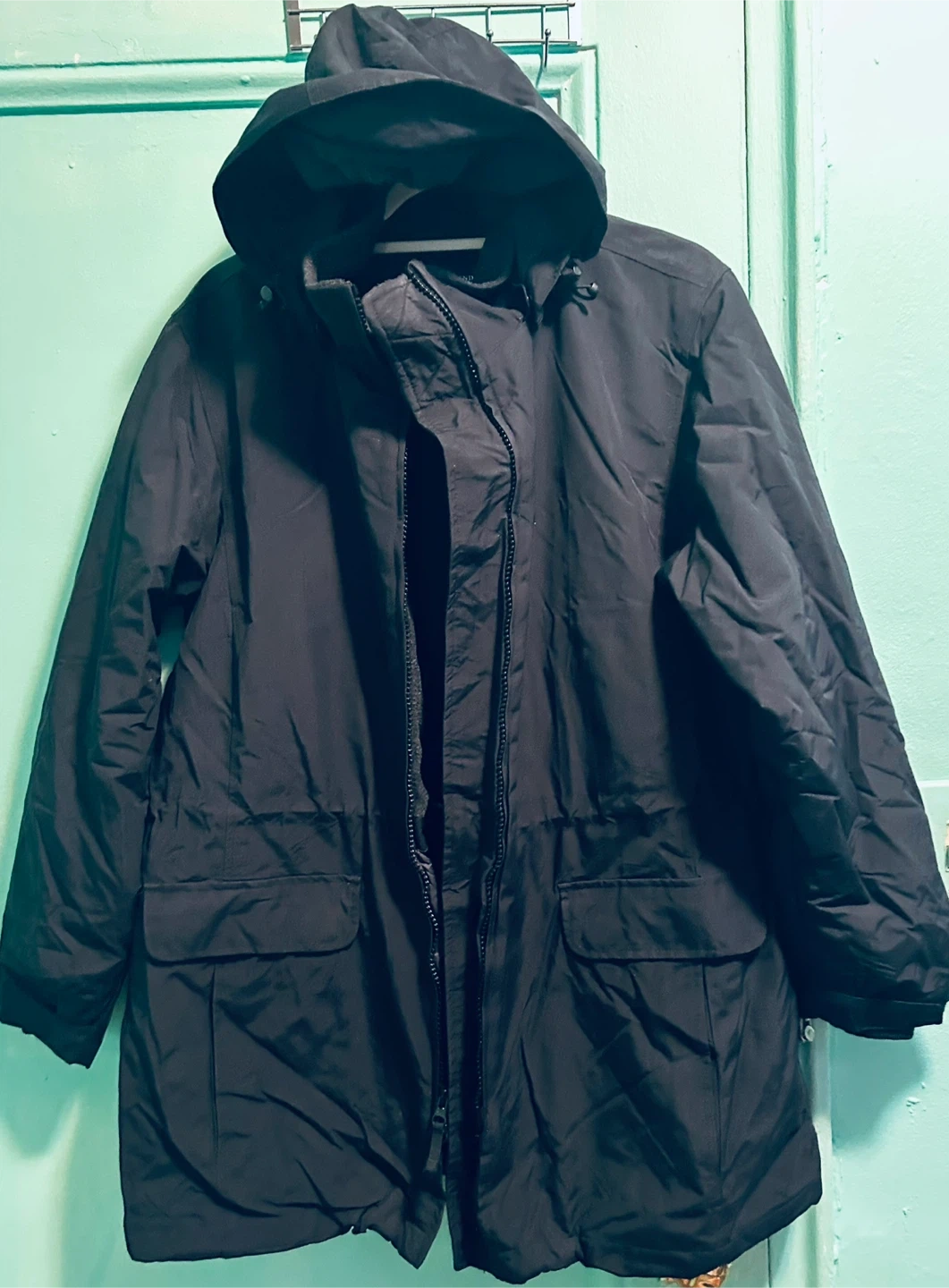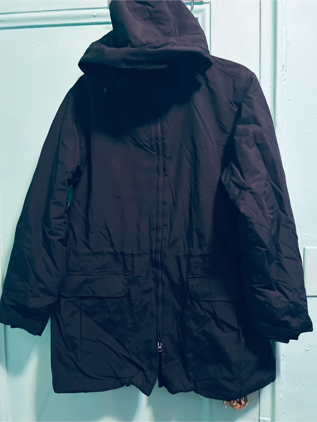 Selling a black hooded parka. It appears to be in good condition and has a zipper and button closure. Perfect for cooler weather!