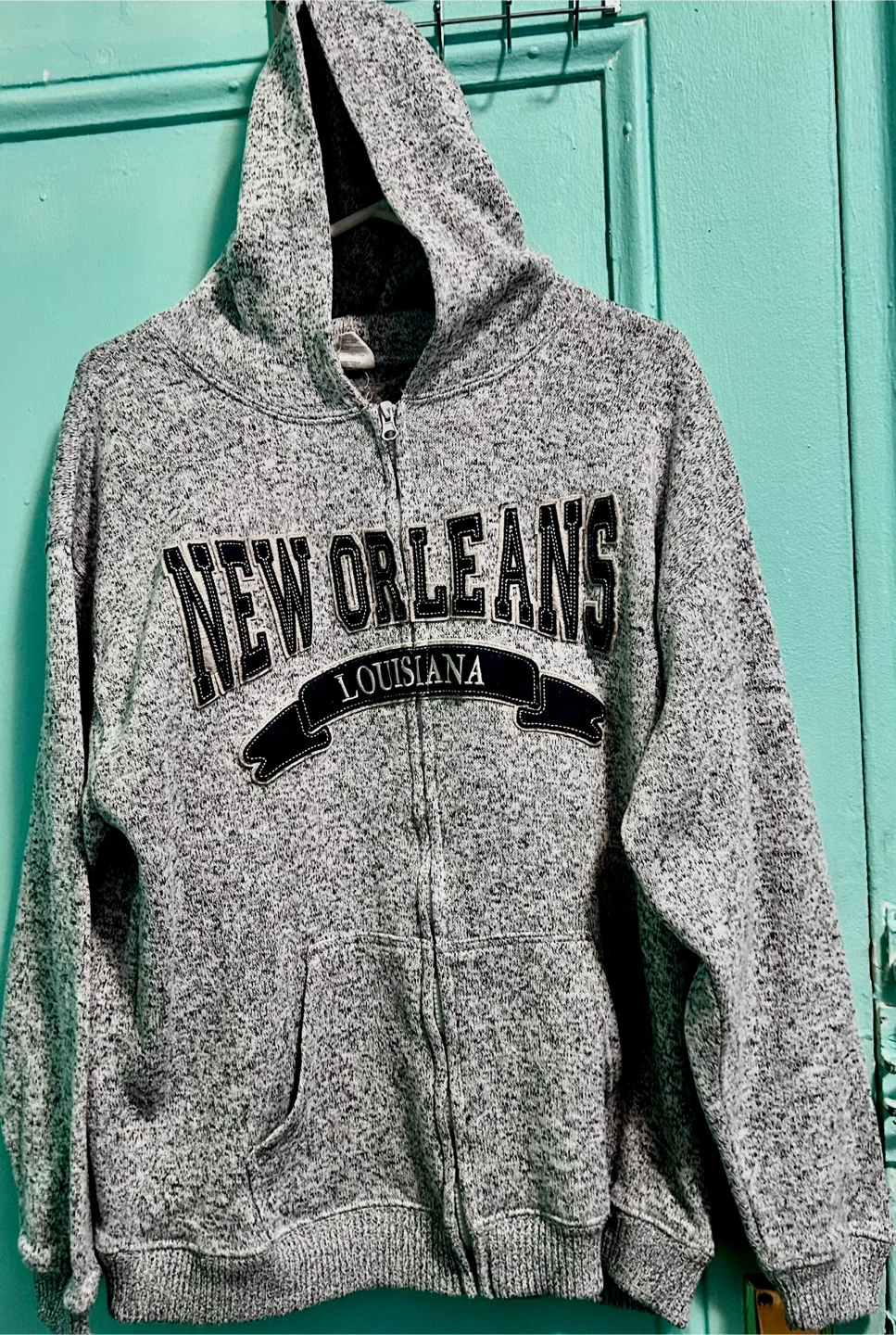 Selling a heather gray full zip hoodie with "New Orleans Louisiana" embroidered on the front. It has a cozy feel and a front pocket. Perfect for showing off your New Orleans pride!
