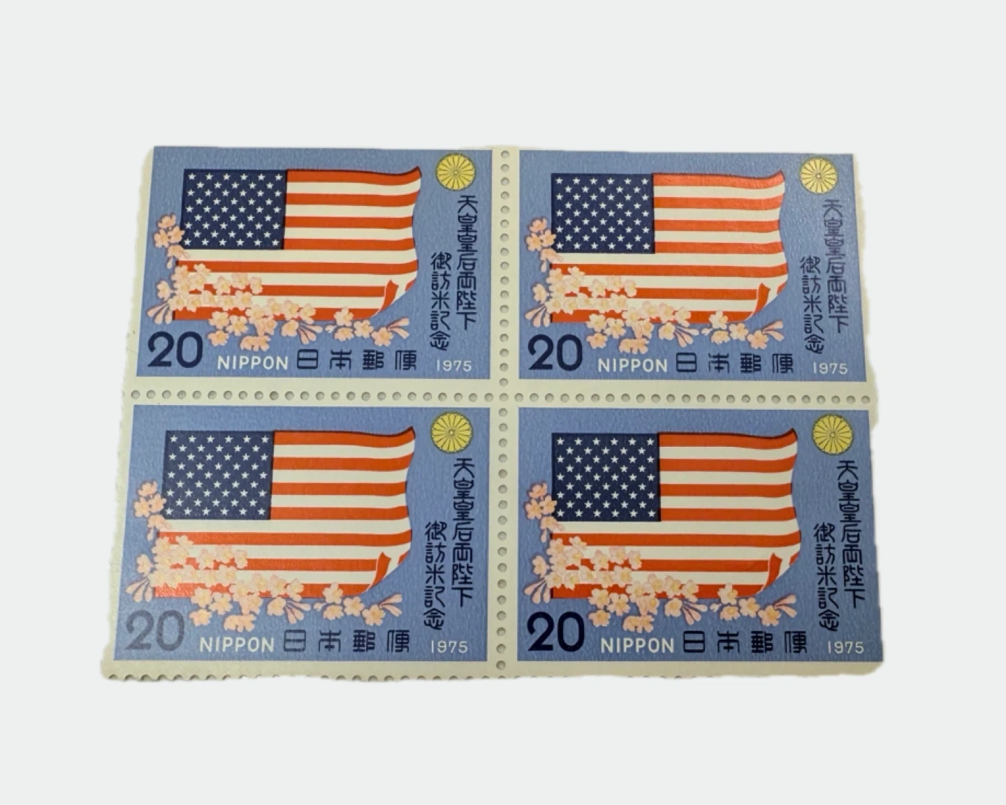 1000+JAPAN MNH ** 1975 Visit of Emperor Hirohito FLAGS FLOWERS Japan Scott #1232-1234, Mint Never Hinged CV: $1.40 each Selling a set of 4 vintage 1975 Nippon 20 Yen stamps featuring the US flag and cherry blossoms. These stamps commemorate the visit of the Emperor and Empress of Japan to the United States. In great condition stored in stamp collectors book, never used! A great addition to any stamp collection!