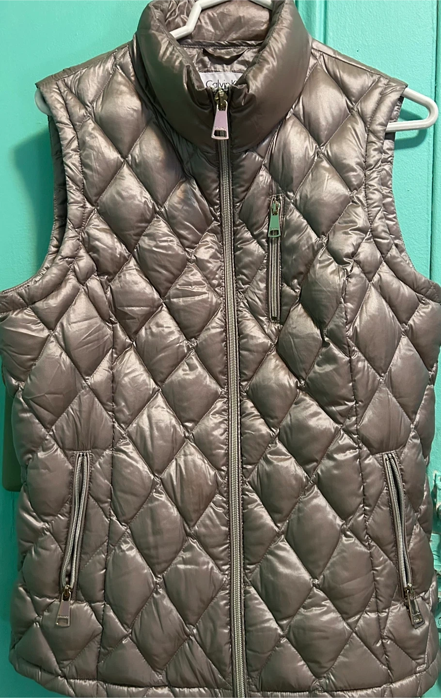 Here's a Calvin Klein puffer vest in a stylish silver color. It has a full zipper and zippered pockets. Perfect for layering!