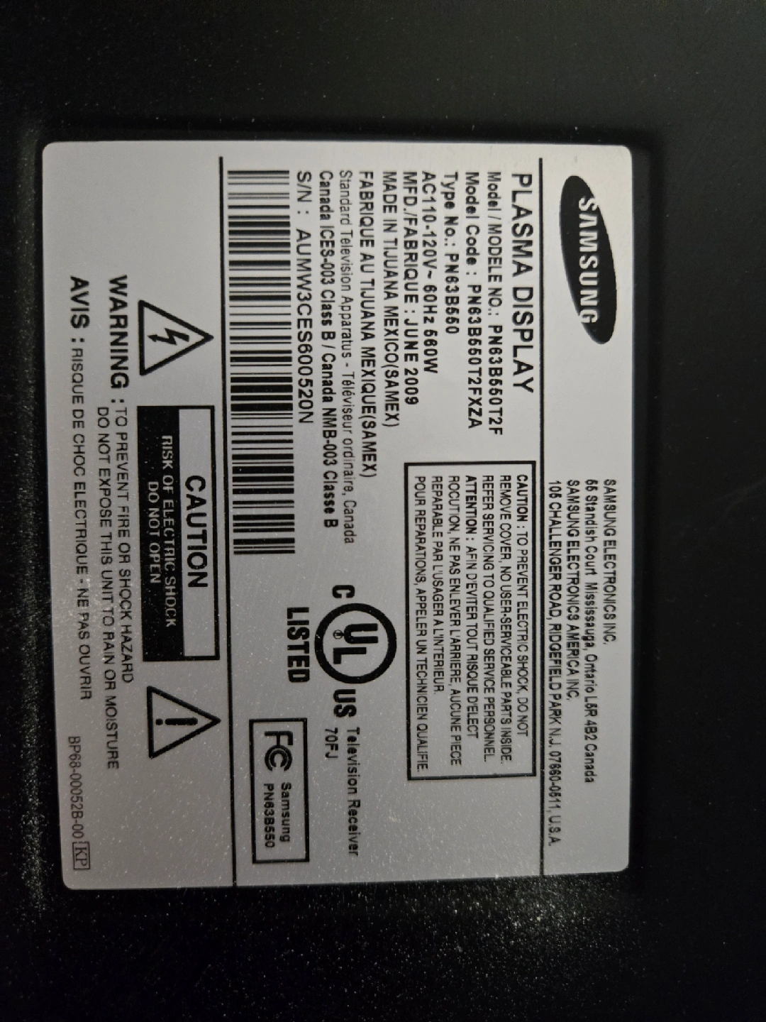76Selling a Samsung Plasma TV, model number PN63B650T2F. It's a 63-inch plasma display with 1080p Full HD, SRS TruSurround HD, and Dolby Digital. Great for a home theater setup! It was mounted on the wall. We do not have the desk stand. I do have a Samsung remote but haven't tested it with this TV. If it works you can have it if it doesn't you might have to buy the remote. I have a wall mount .It's sold separately. Payment only accepted at the time of purchase after you have seen and tested. will not accept any payments or request for personal information. Until you've seen the item. cash zelle venmo