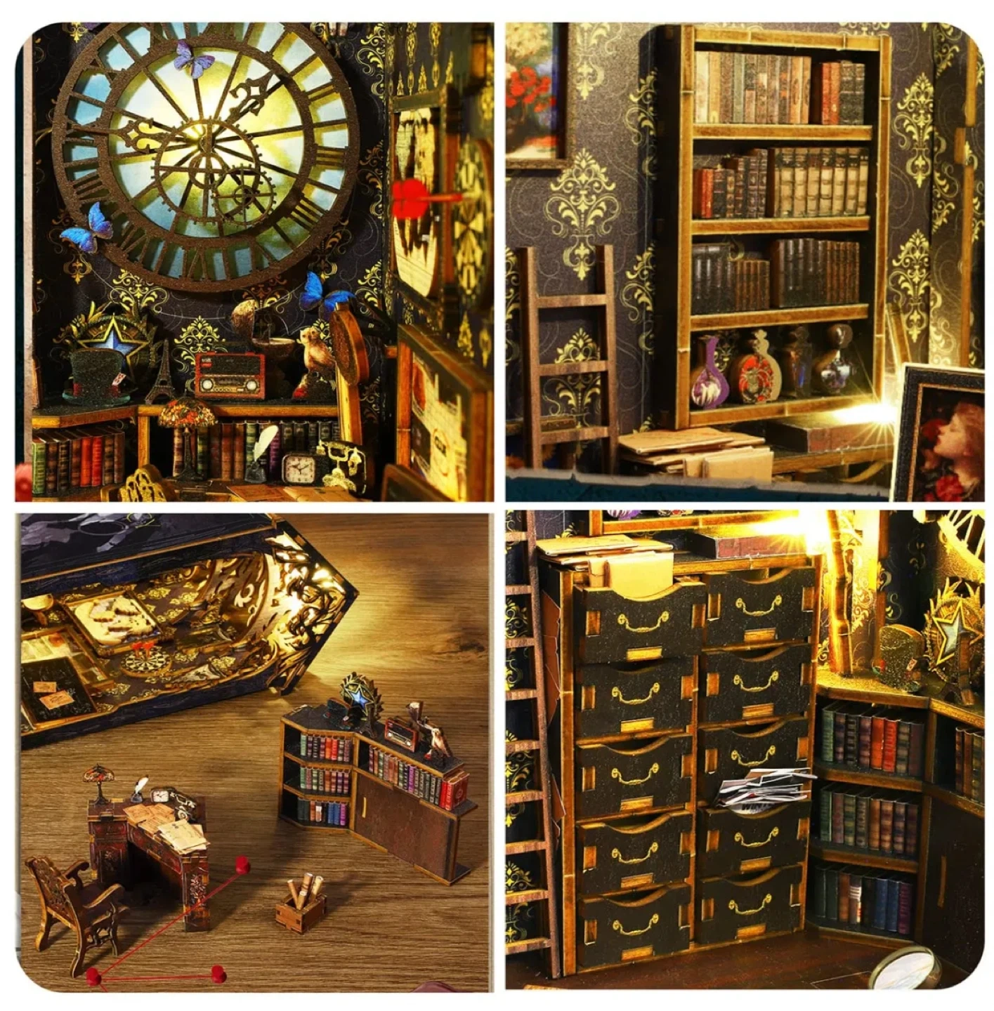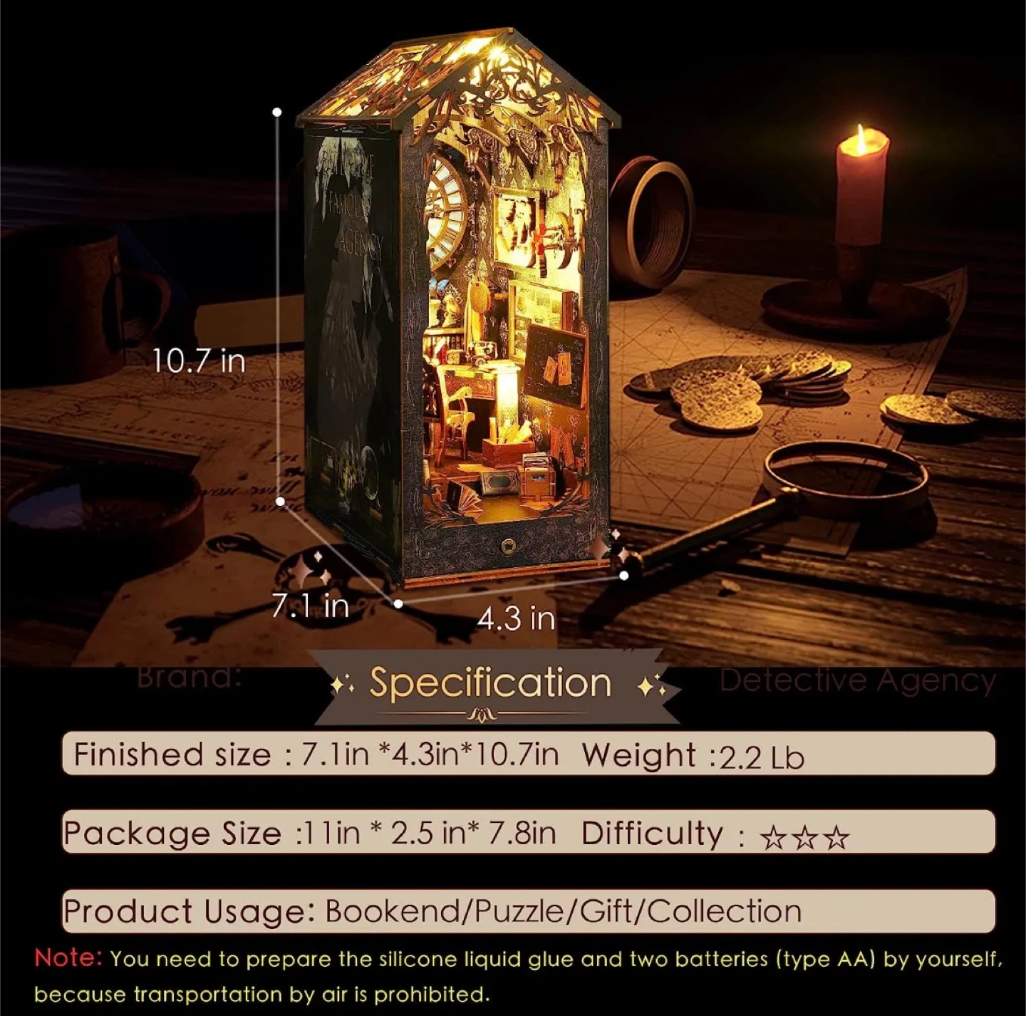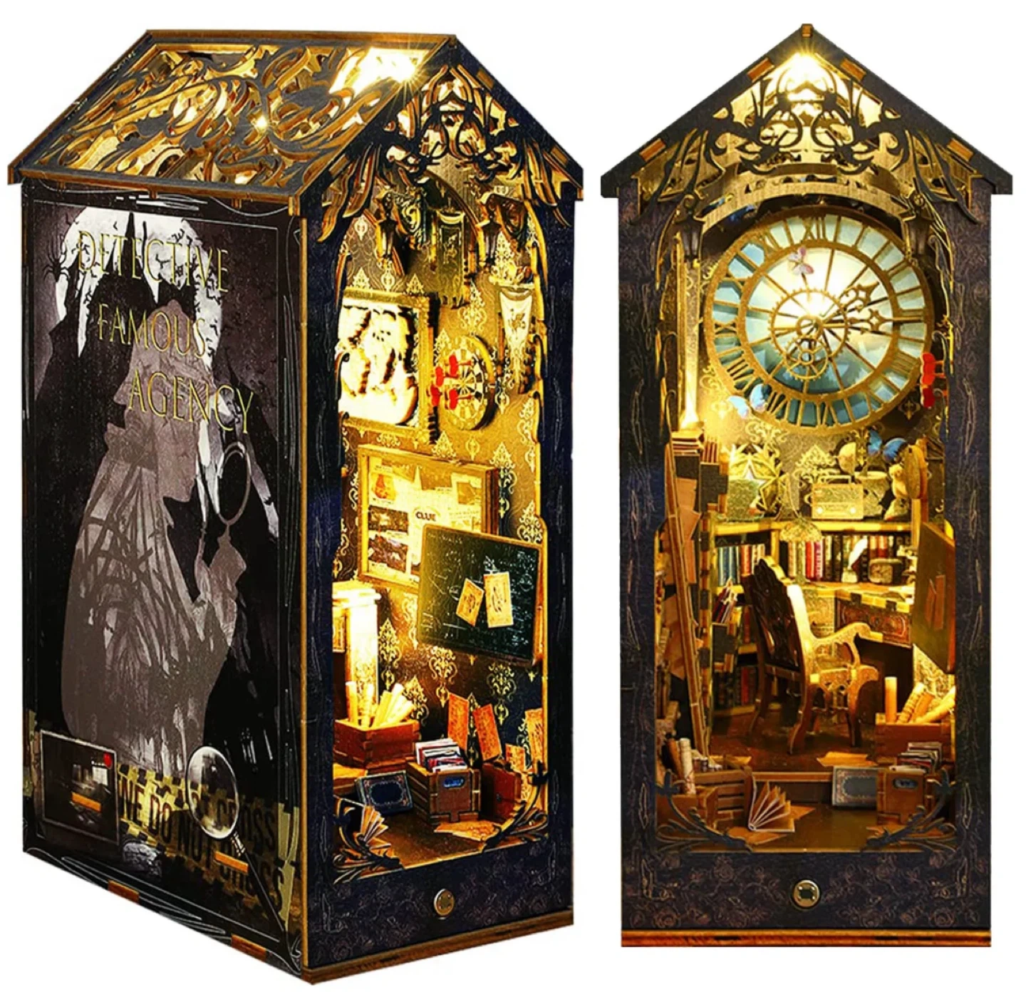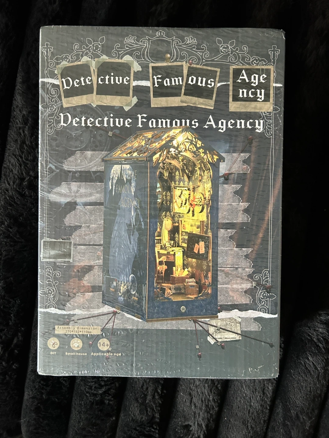 This is a new DIY Book Nook Kit. It's the Detective Famous Agency model. It's a fun project for ages 14+. The kit includes everything you need to create a miniature detective agency scene for your bookshelf. Assembly dimensions are 200x110x240mm. It includes LED lights to illuminate the scene. Get ready to build your own little world!