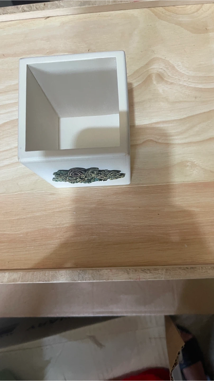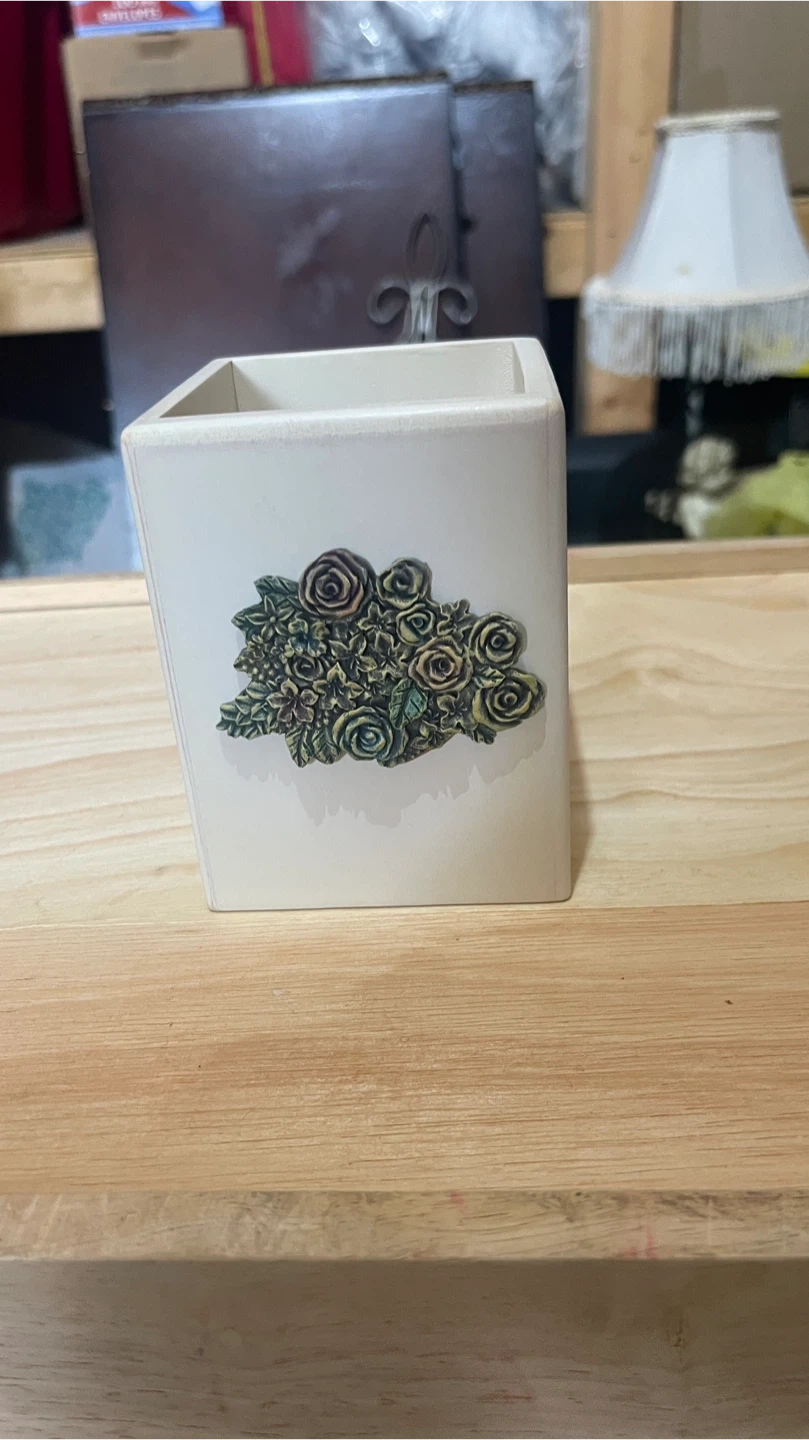 Here's a cute pen or pencil holder with a floral design! It's in great condition and ready to brighten up your desk or workspace