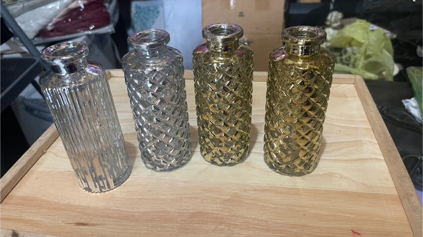 196I'm selling a set of four decorative glass vases! Two are silver and two are gold. They have a unique textured pattern that catches the light beautifully. These vases would add a touch of elegance to any room!
