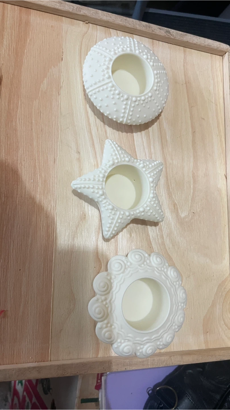 Here's a set of three decorative candle holders! They're all different shapes: a sea urchin, a starfish, and a flower. They are a nice off-white color and would look great on a shelf or table
