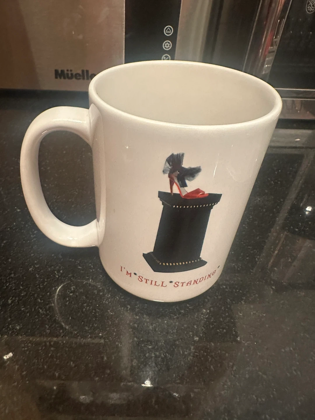 Here's a cute white mug with a red high heel on it! The mug also says "I'm Still Standing" in red lettering.