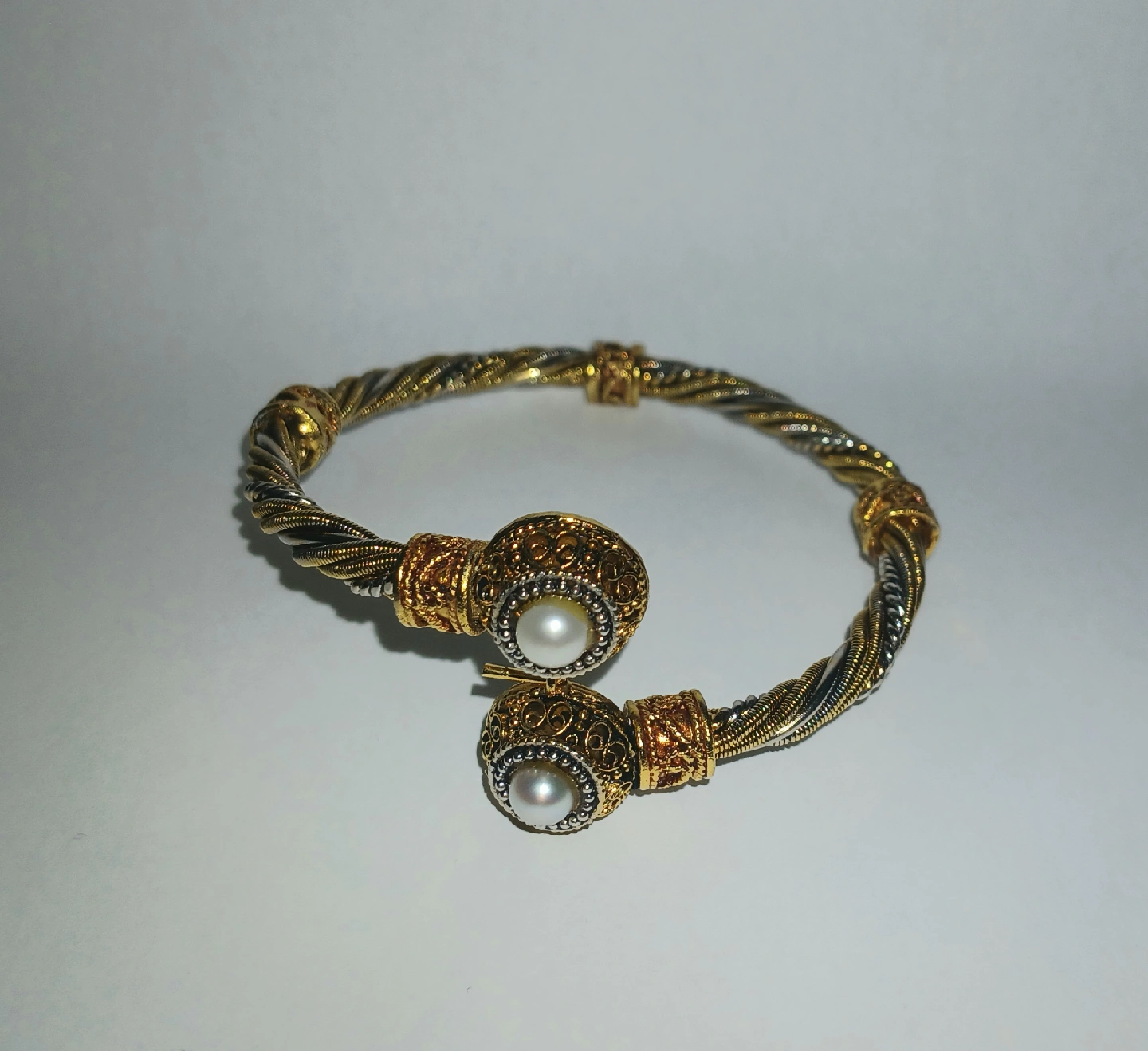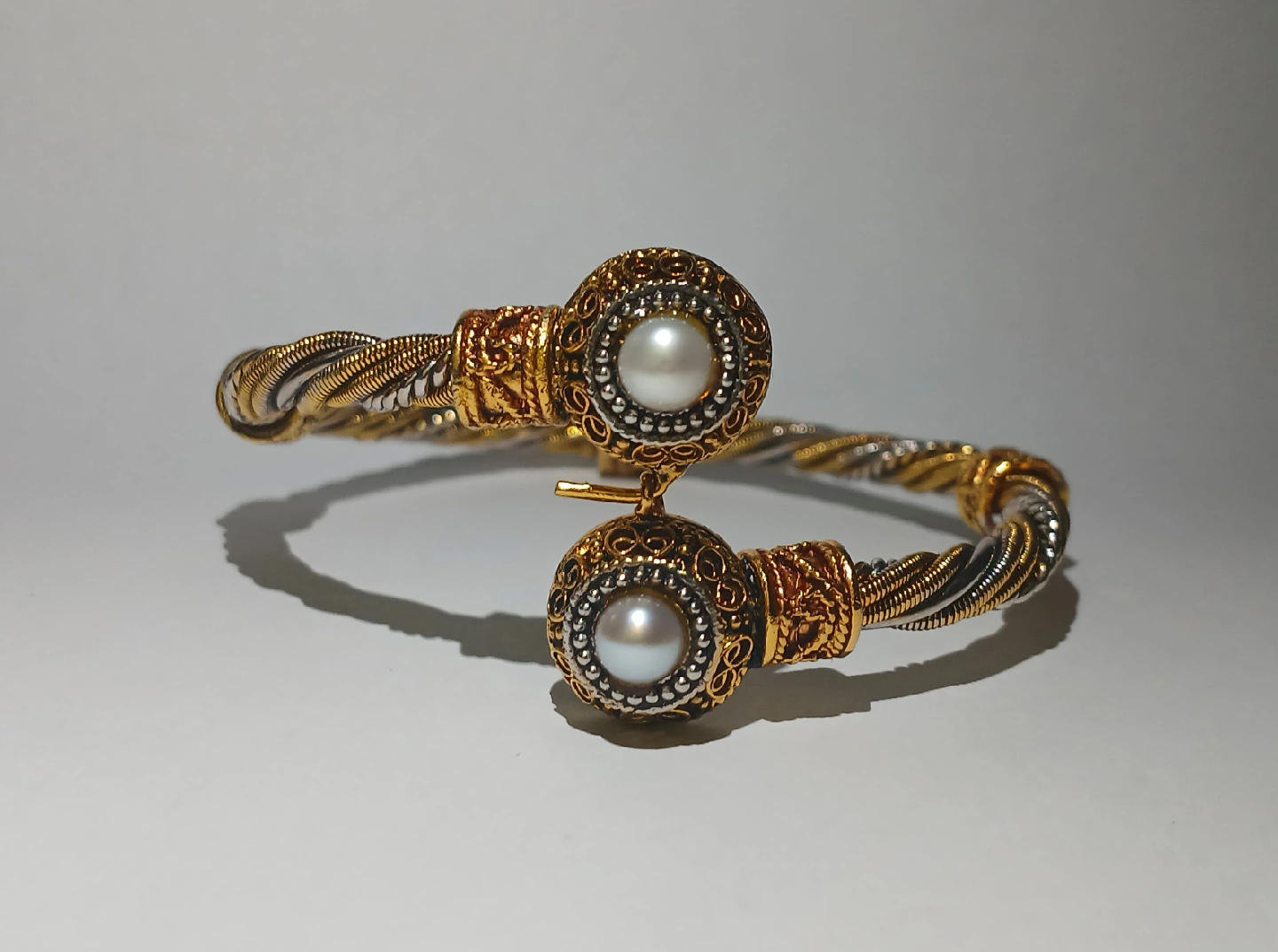 15Beautiful south Asian style bangle featuring faux pearls in a gold and silver twisted design. It's in great condition and would make a lovely addition to any jewelry collection!