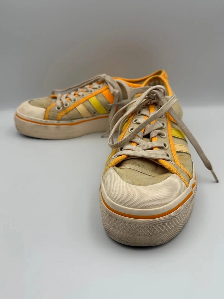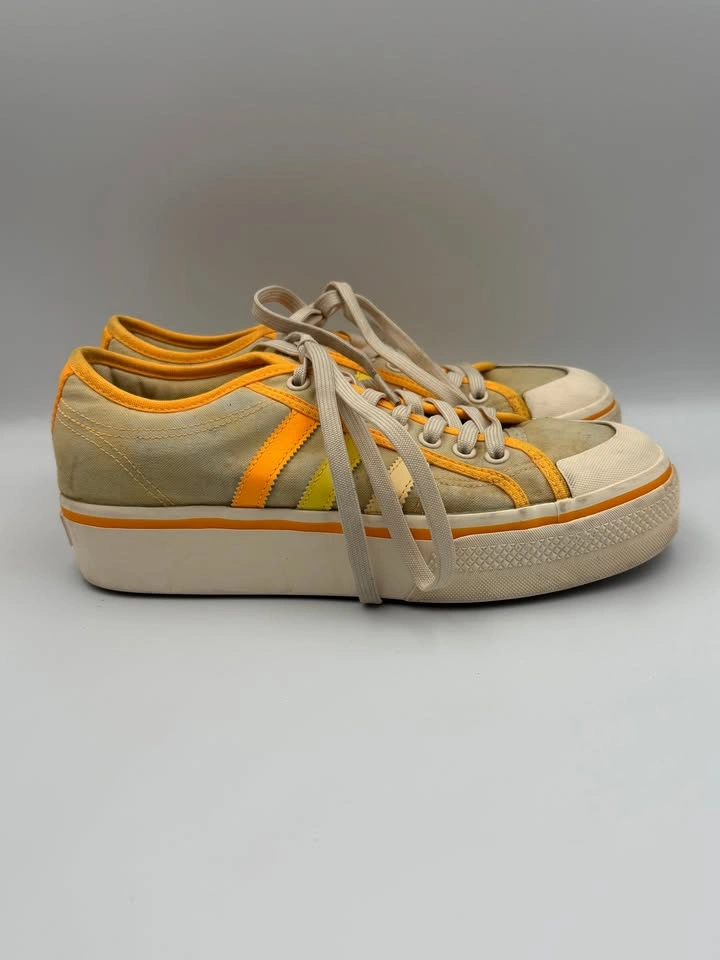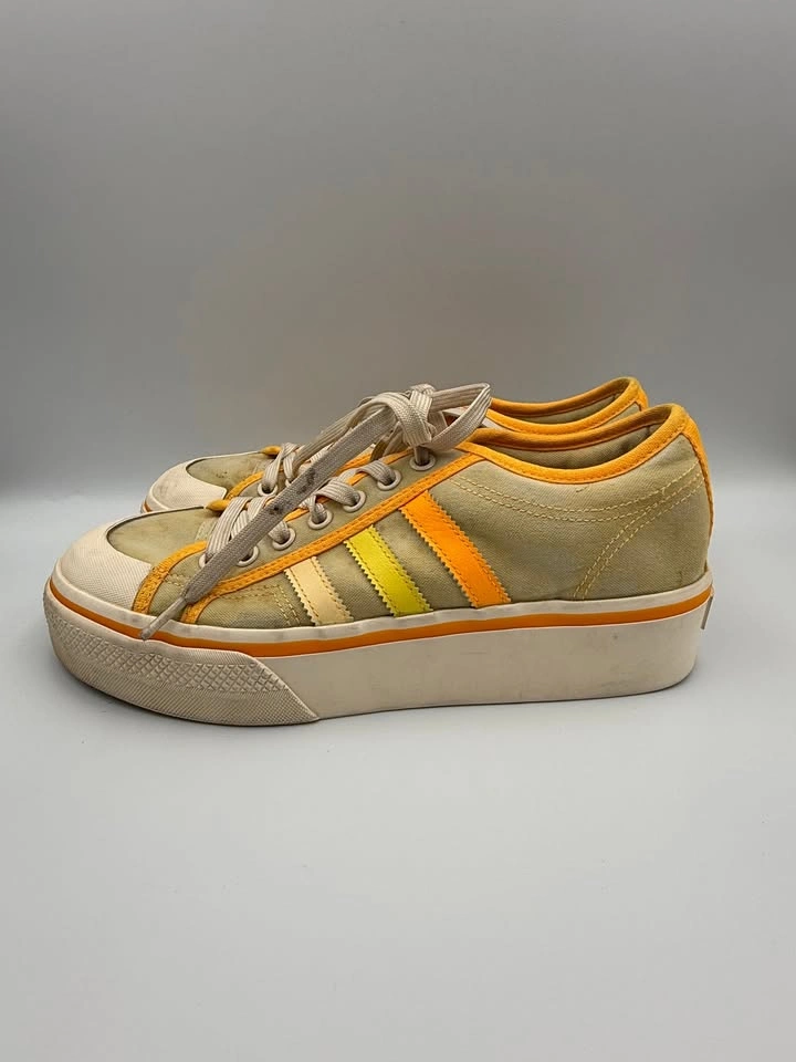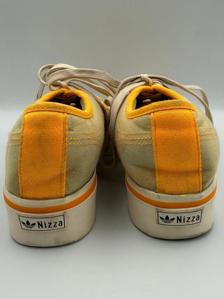 Adidas Nizza Platform sneakers (Woman’s Size 9.5) are in good pre-owned condition with visible flaws. Signs of wear include scuffs, marks on the midsoles, and some discoloration on the uppers. Despite these flaws, the sneakers are still structurally sound and fully wearable with plenty of life left. Please see all photos for details. Step into retro style with these Adidas Nizza Platform sneakers in a bold yellow, orange, and white colorway. Featuring the signature vulcanized platform sole and classic low-top silhouette, these shoes deliver timeless streetwear appeal. Though they show visible flaws, they remain a stylish and versatile choice for casual wear, everyday outfits, or anyone looking for an affordable pair of vintage-inspired Adidas sneakers. Brand: Adidas Model: Nizza Platform Style: Casual / Lifestyle Sneakers Color: Yellow / Orange / White US Shoe Size: 9.5 Condition: Pre-owned, Good Condition w/ Visible Flaws Closure: Lace-Up Upper Material: Canvas / Textile Sole Material: Rubber Features: Classic Retro Style, Vulcanized Sole, Everyday Wear