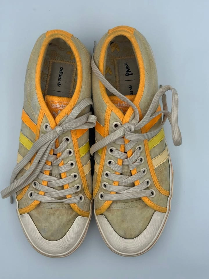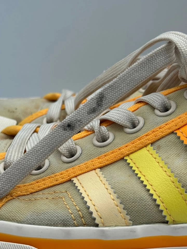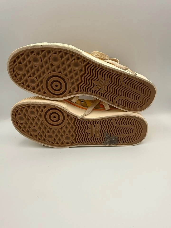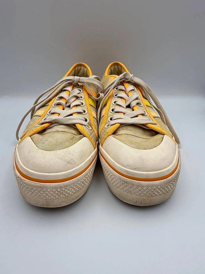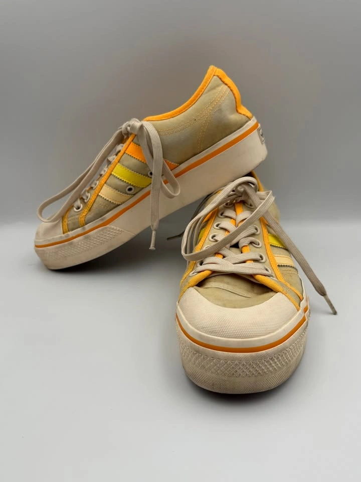Adidas Nizza Platform sneakers (Woman’s Size 9.5) are in good pre-owned condition with visible flaws. Signs of wear include scuffs, marks on the midsoles, and some discoloration on the uppers. Despite these flaws, the sneakers are still structurally sound and fully wearable with plenty of life left. Please see all photos for details. Step into retro style with these Adidas Nizza Platform sneakers in a bold yellow, orange, and white colorway. Featuring the signature vulcanized platform sole and classic low-top silhouette, these shoes deliver timeless streetwear appeal. Though they show visible flaws, they remain a stylish and versatile choice for casual wear, everyday outfits, or anyone looking for an affordable pair of vintage-inspired Adidas sneakers. Brand: Adidas Model: Nizza Platform Style: Casual / Lifestyle Sneakers Color: Yellow / Orange / White US Shoe Size: 9.5 Condition: Pre-owned, Good Condition w/ Visible Flaws Closure: Lace-Up Upper Material: Canvas / Textile Sole Material: Rubber Features: Classic Retro Style, Vulcanized Sole, Everyday Wear