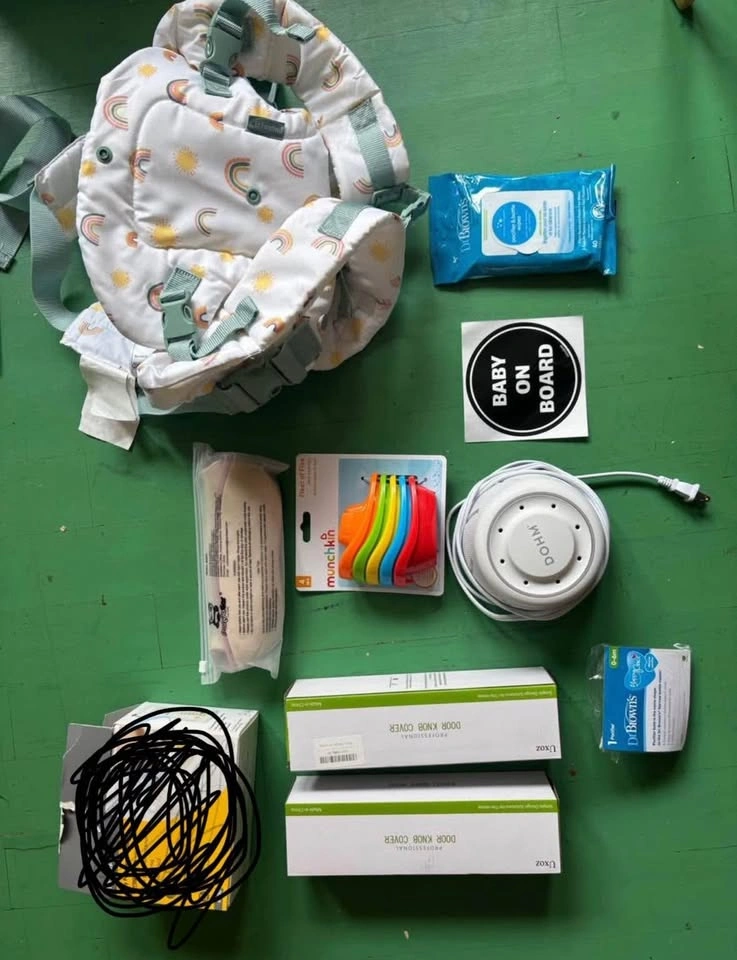 6450 for all items, includes a boppy nursing pillow, postpartum care supplies, car seat/nursing cover, pacifier/bottle wipes, door knob covers, bath toys, baby carrier, silicon bibs, baby on board sticker.