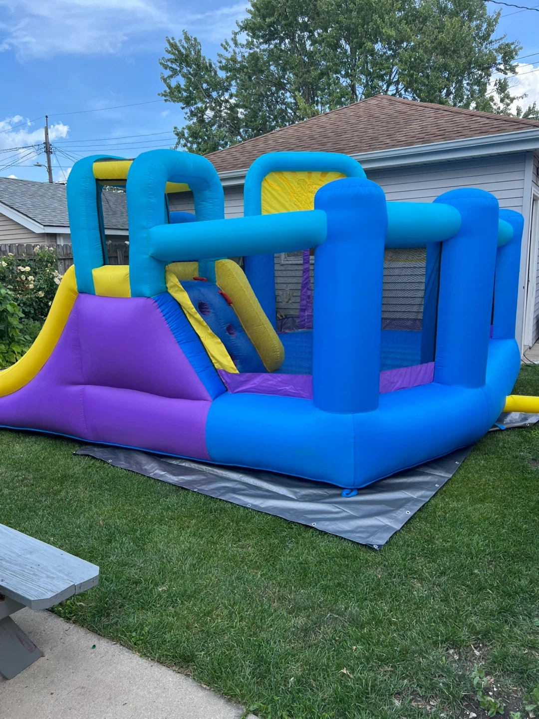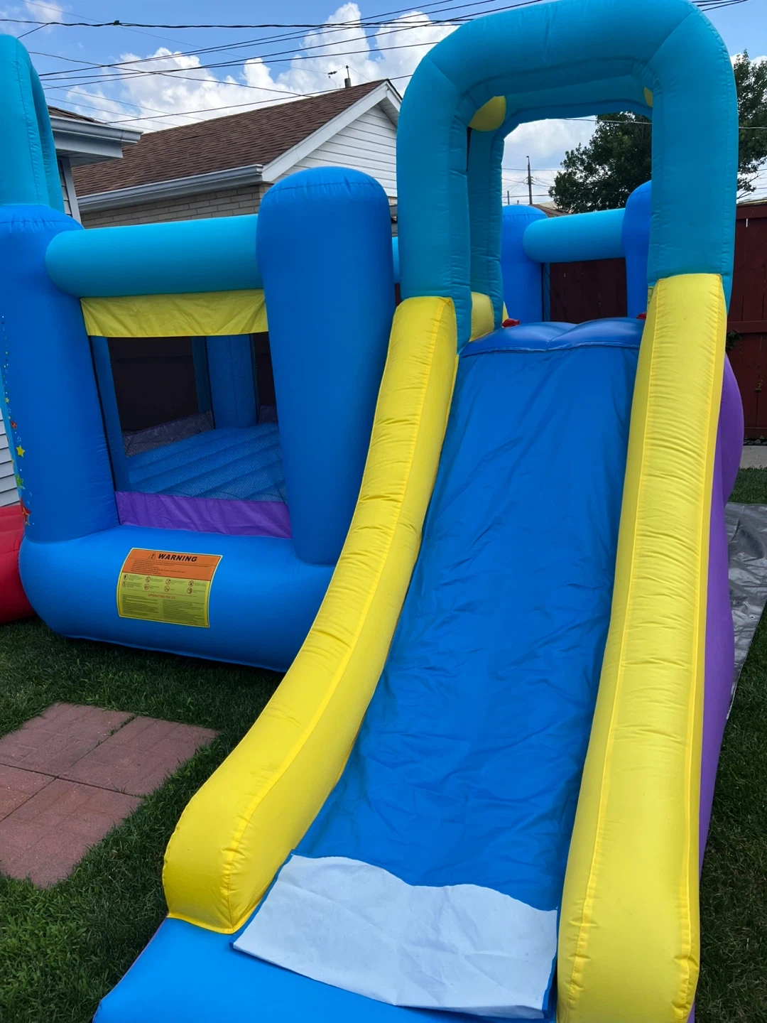 This is a fun bounce house with a slide! It's in great condition and ready for some backyard fun. The colors are bright and vibrant, perfect for kids. It's easy to set up and take down, making it convenient for storage. Hours of entertainment for the little ones!