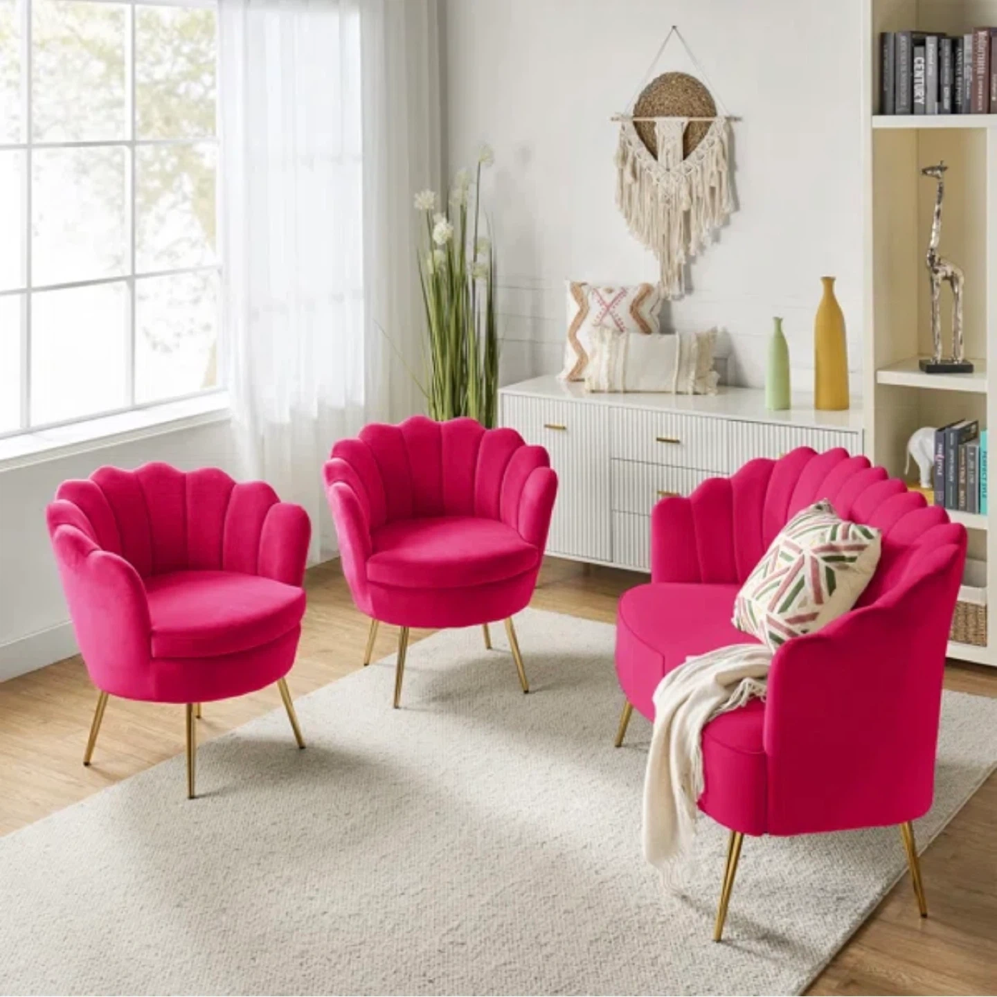153 piece velvet fuchsia set Add a pop of color to your living space with this vibrant pink velvet accent chair and loveseat set! The unique design and plush velvet material make it a stylish and comfortable addition to any home. Perfect for creating a cozy and inviting atmosphere. Loveseat 35" H X 50.2" W X 27" D Accent Chair 19.5" H X 20" W X 22"' D Pick up from an elevator building in Crown Heights.
