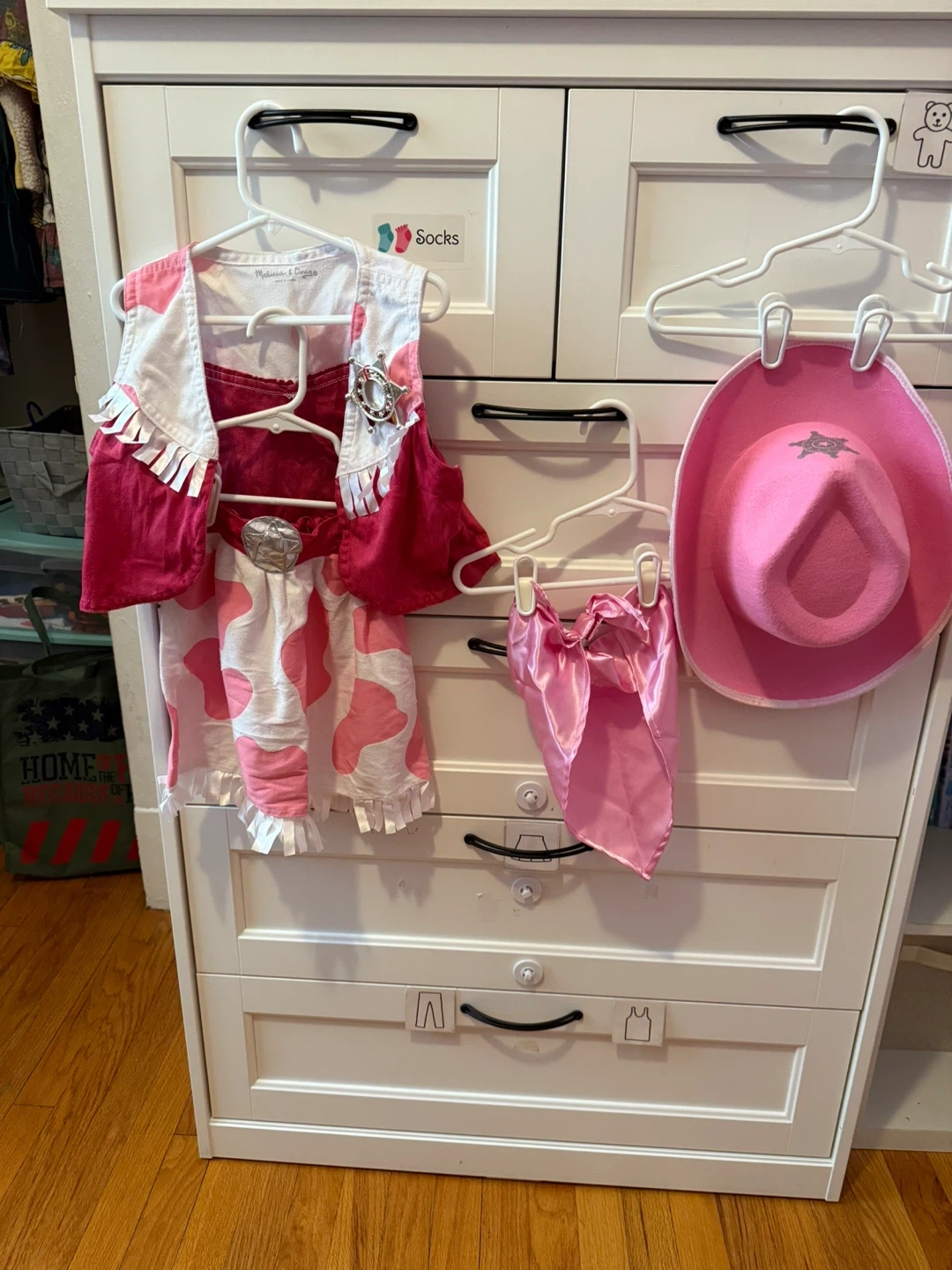 65Howdy! This adorable Melissa & Doug cowgirl costume set is ready for new adventures! It includes a pink cow print dress with a vest, a pink cowboy hat, and a matching scarf. Perfect for dress-up and imaginative play!