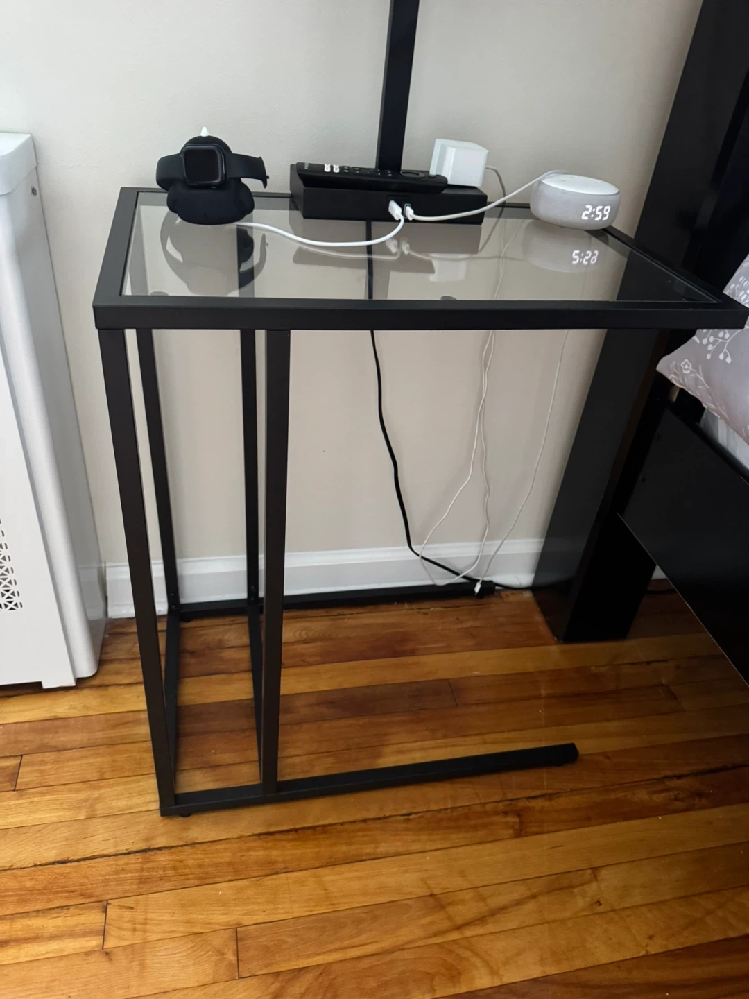 This is a sleek black metal side table with a glass top. It's perfect for holding small items next to your bed or sofa. The minimalist design makes it a great fit for any modern home!