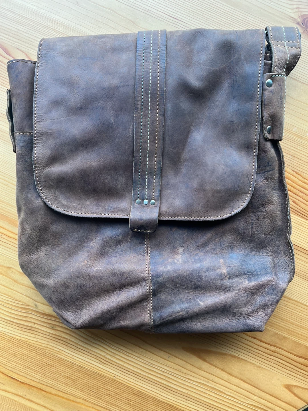 124Leaving NY …. Need some help selling some items so looking for a new home for this real leather messenger bag 🙏🙂 This is a Greenwood leather messenger bag in brown. It has a vintage look and is perfect for carrying your essentials. The bag features a flap closure with a magnetic snap, an adjustable shoulder strap, and multiple interior pockets. It's a stylish and practical bag for everyday use
