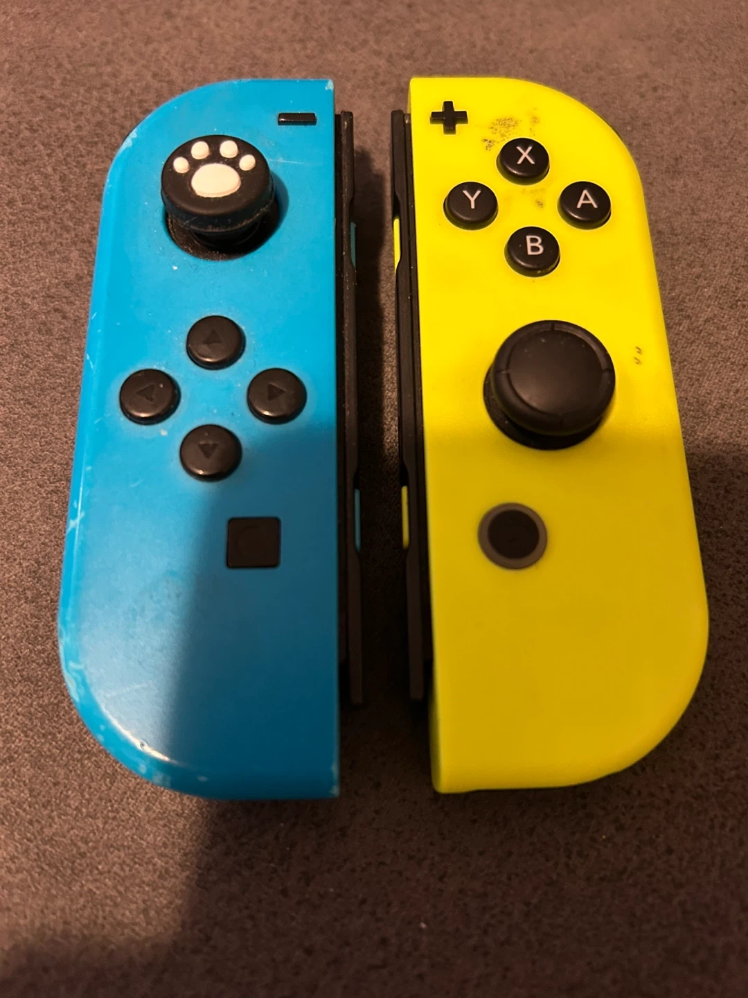 Selling a pair of Nintendo Switch Joy-Cons. One is blue and the other is yellow. They show some signs of use.