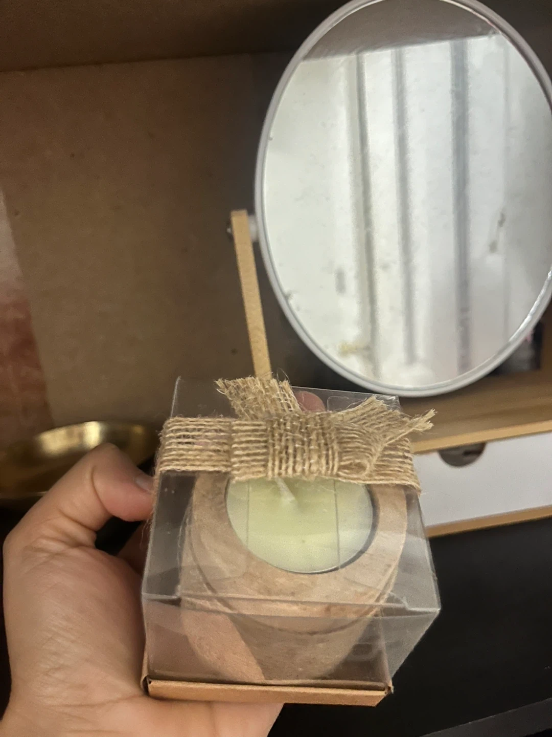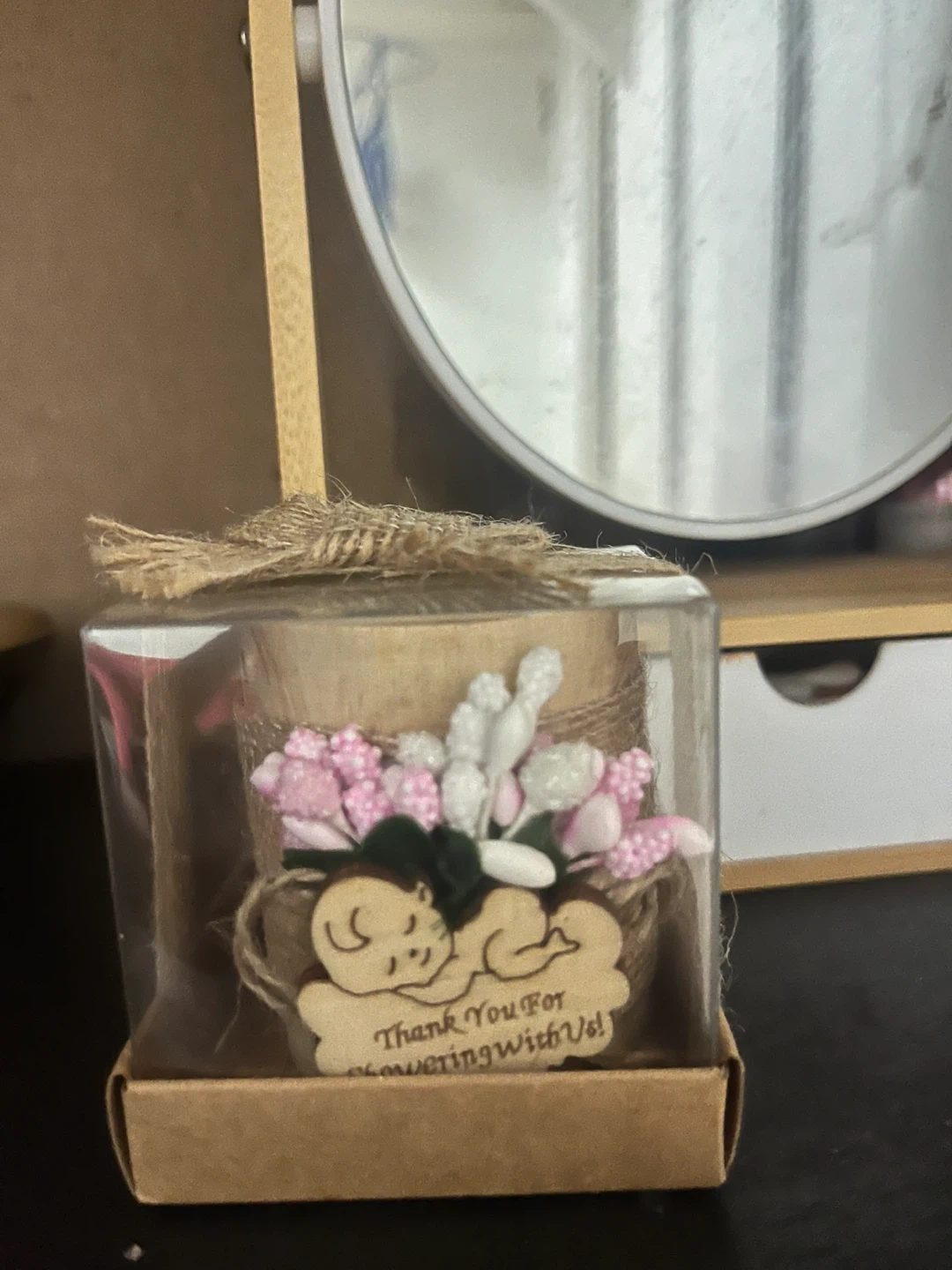 670This is a baby shower favor candle. It's a cute little candle in a clear box, decorated with flowers and a wooden cutout of a baby.