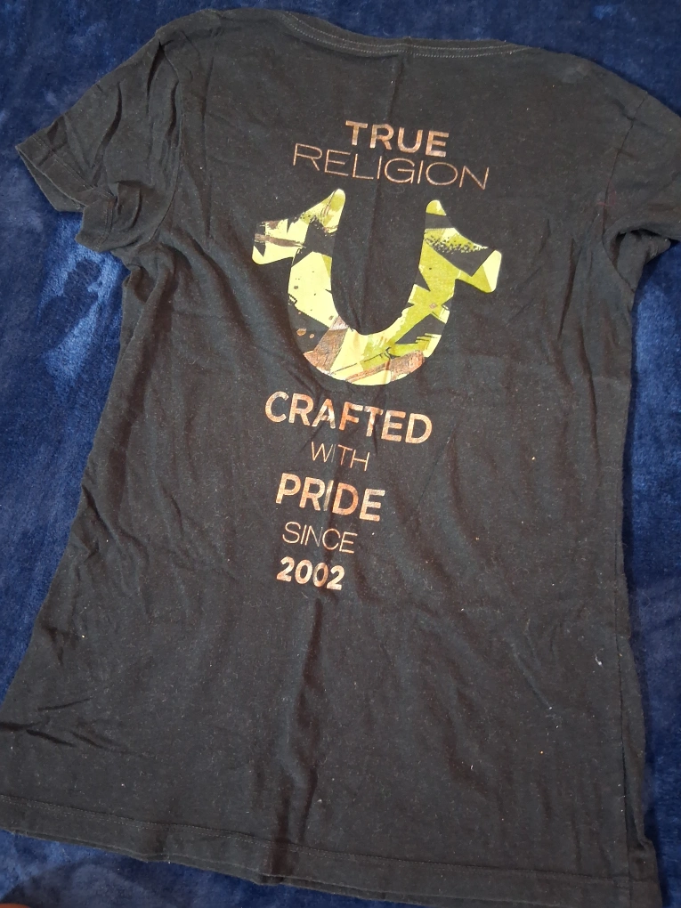 True Religion v-neck tee in black. The back has a large True Religion logo with the words "Crafted With Pride Since 2002"