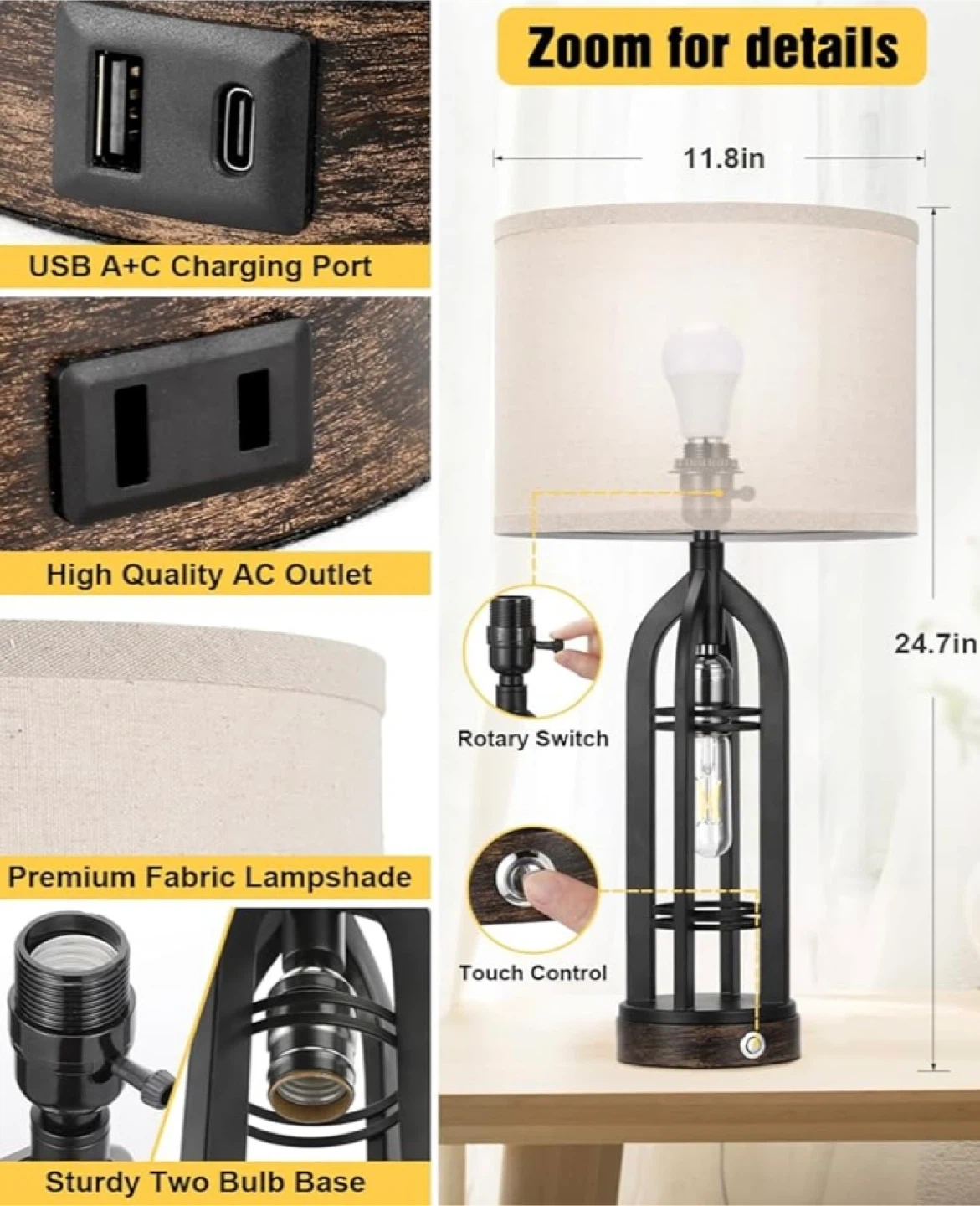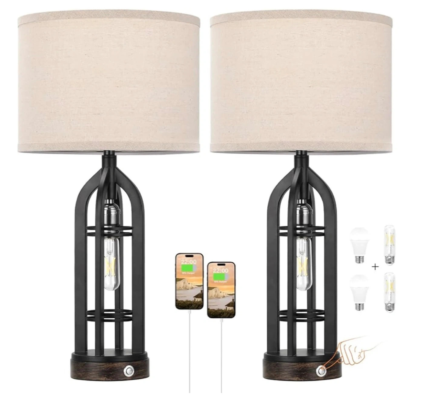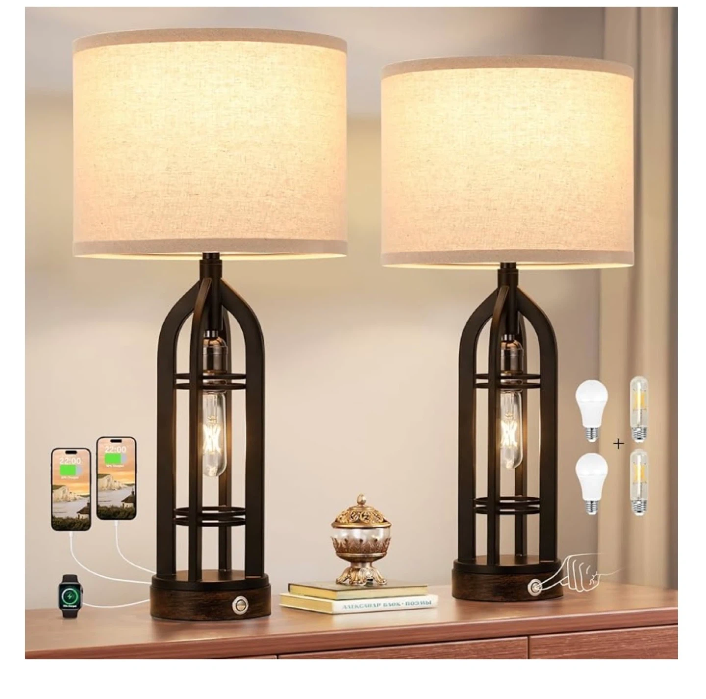 75Selling a set of two industrial cage table lamps. These lamps feature a unique cage design and come with convenient USB and A+C charging ports. They also have a high-quality AC outlet, a premium fabric lampshade, and a sturdy two-bulb base. The lamps are equipped with a rotary switch and touch control for easy operation. Dimensions are approximately 11.8 inches wide and 24.7 inches high