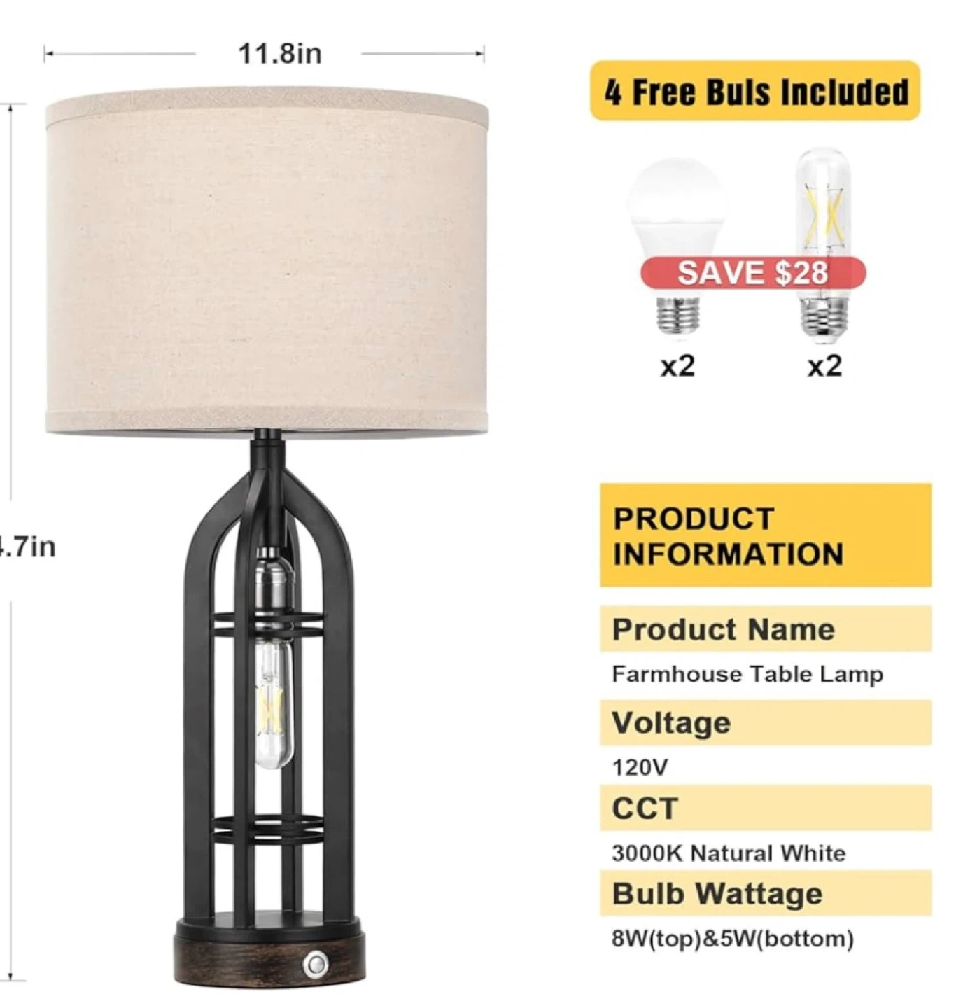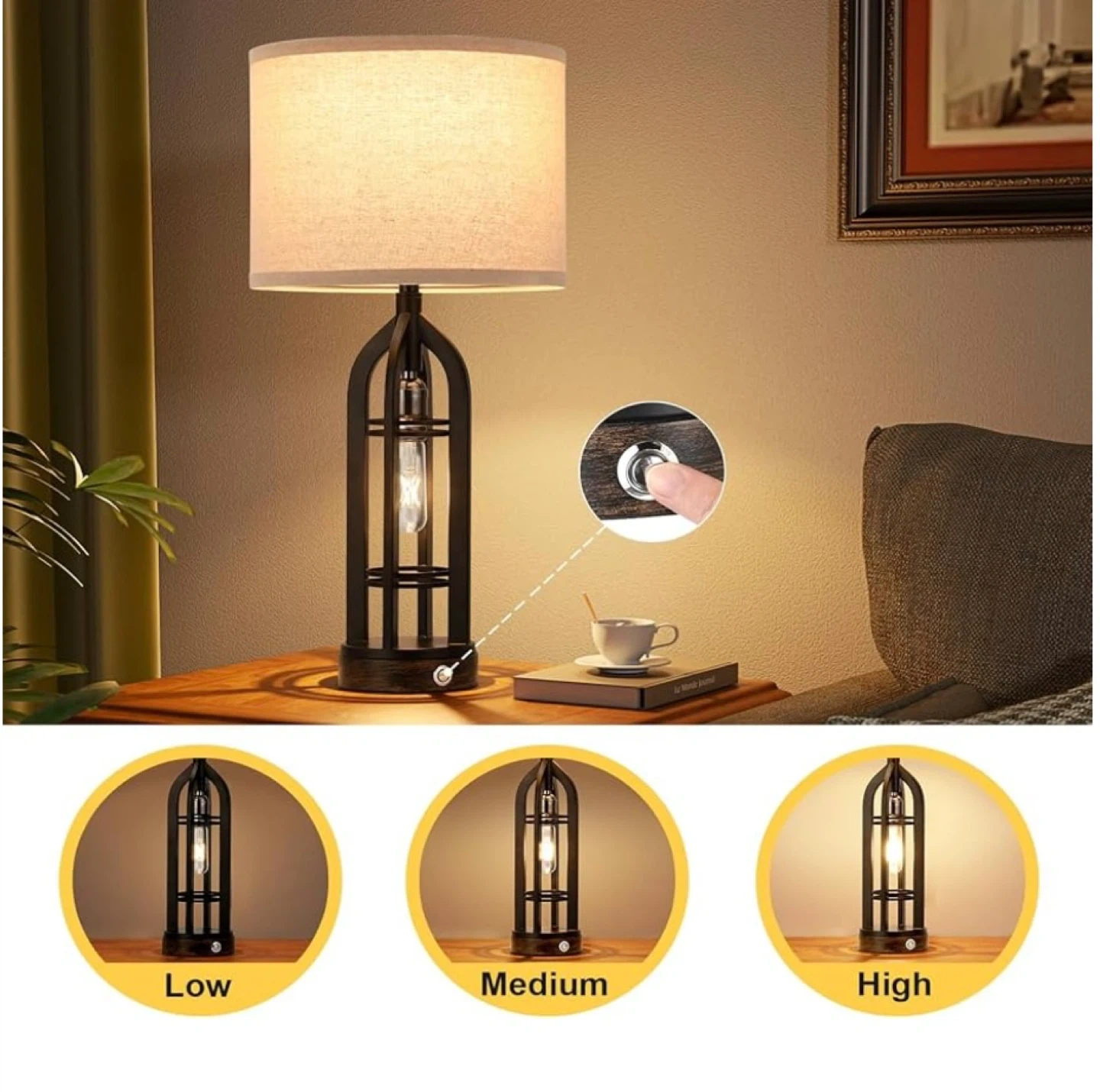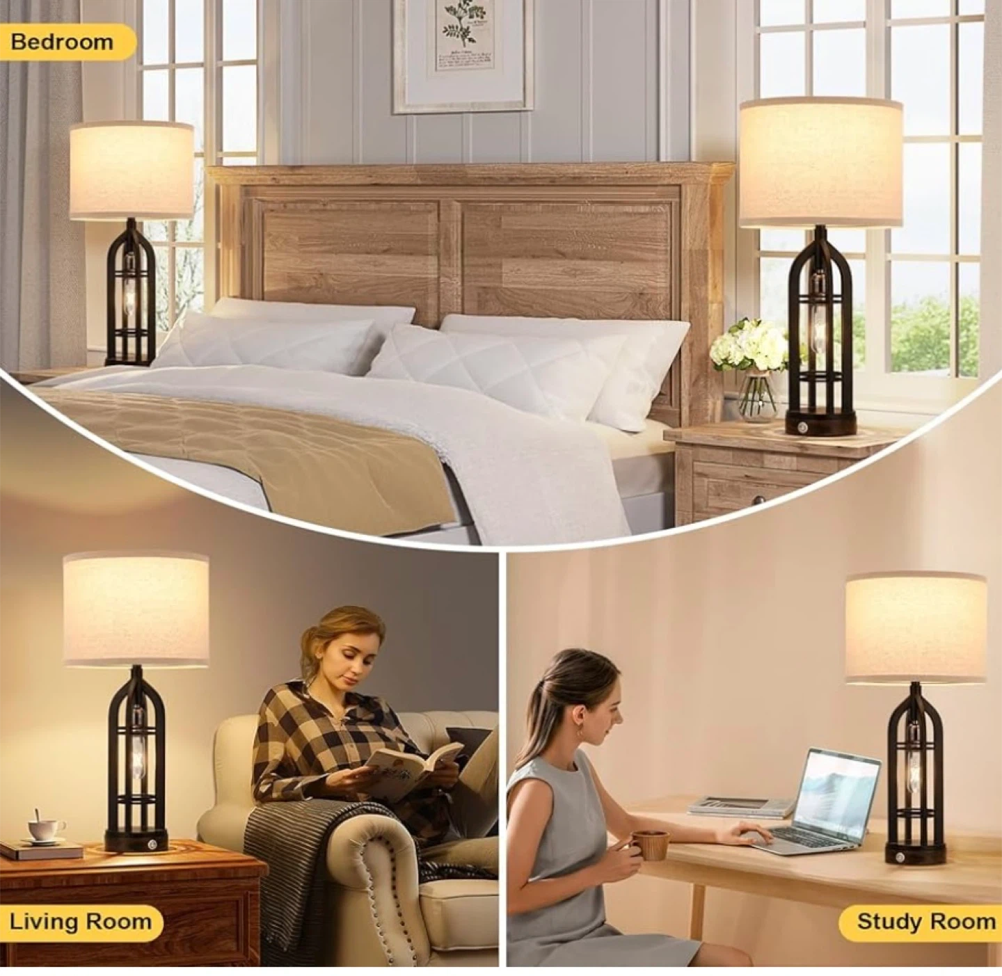 75Selling a set of two industrial cage table lamps. These lamps feature a unique cage design and come with convenient USB and A+C charging ports. They also have a high-quality AC outlet, a premium fabric lampshade, and a sturdy two-bulb base. The lamps are equipped with a rotary switch and touch control for easy operation. Dimensions are approximately 11.8 inches wide and 24.7 inches high