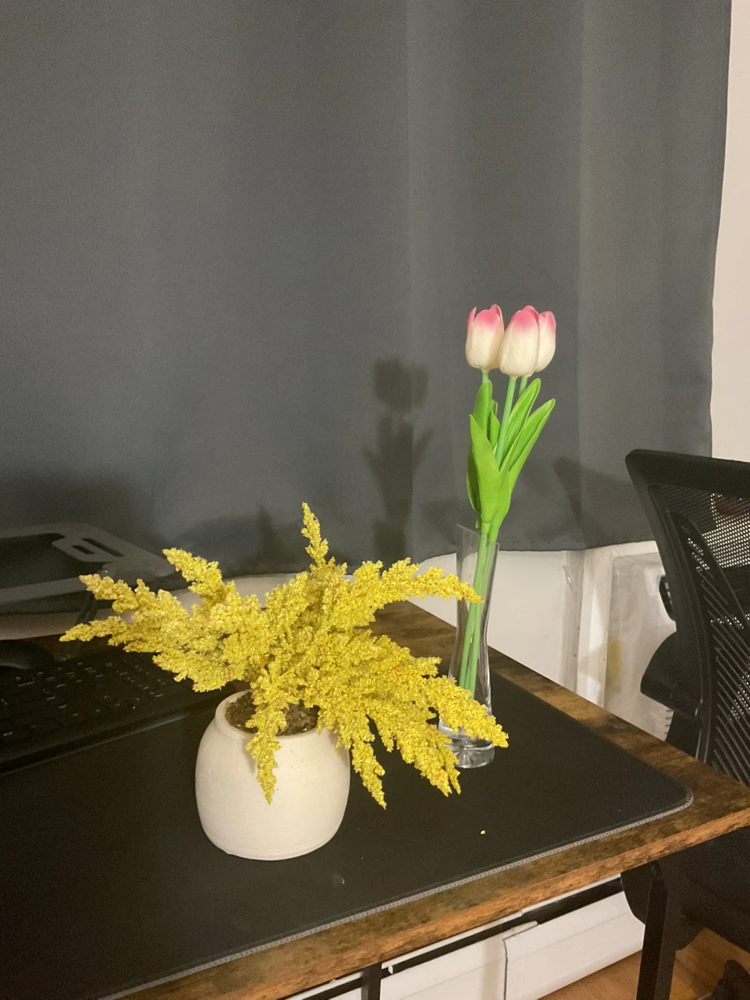Artificial fall flower pot and pink and white tulips in a glass vase