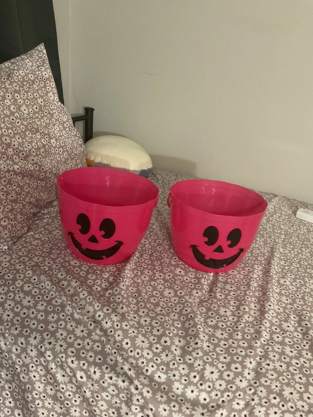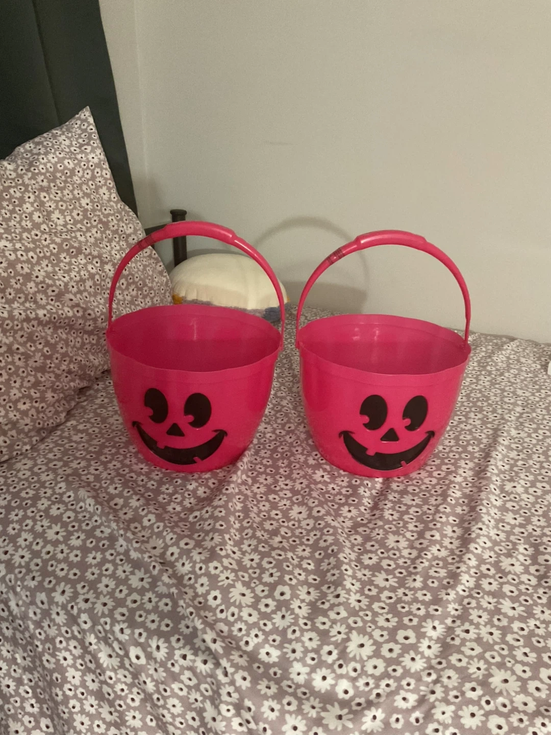 Here are two pink Halloween candy buckets ready for trick-or-treating!