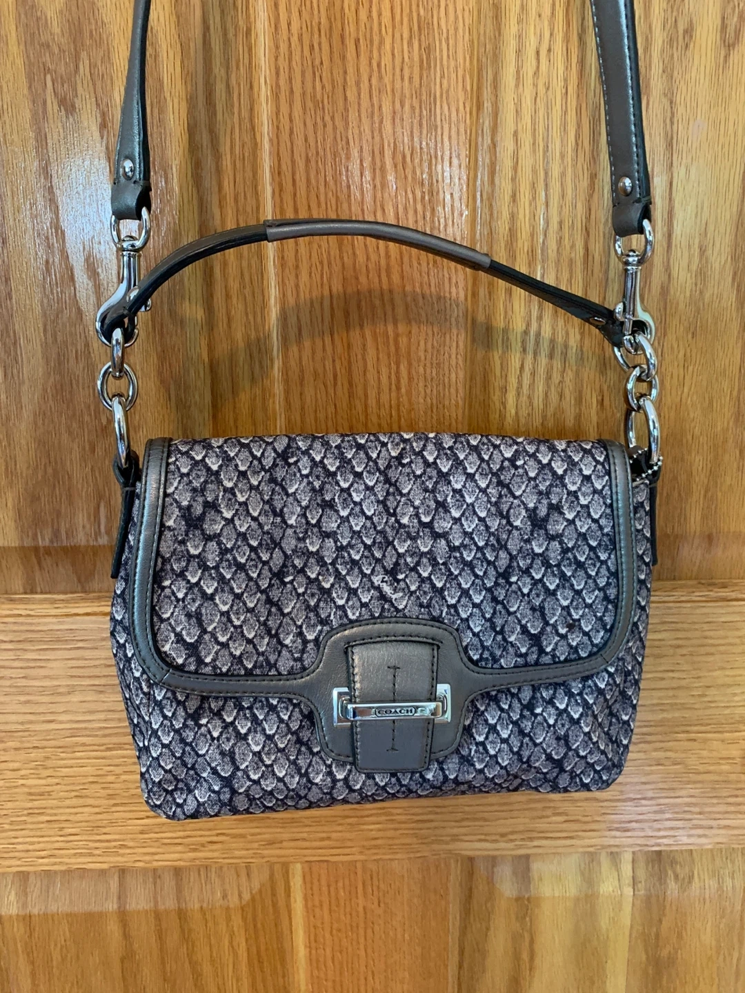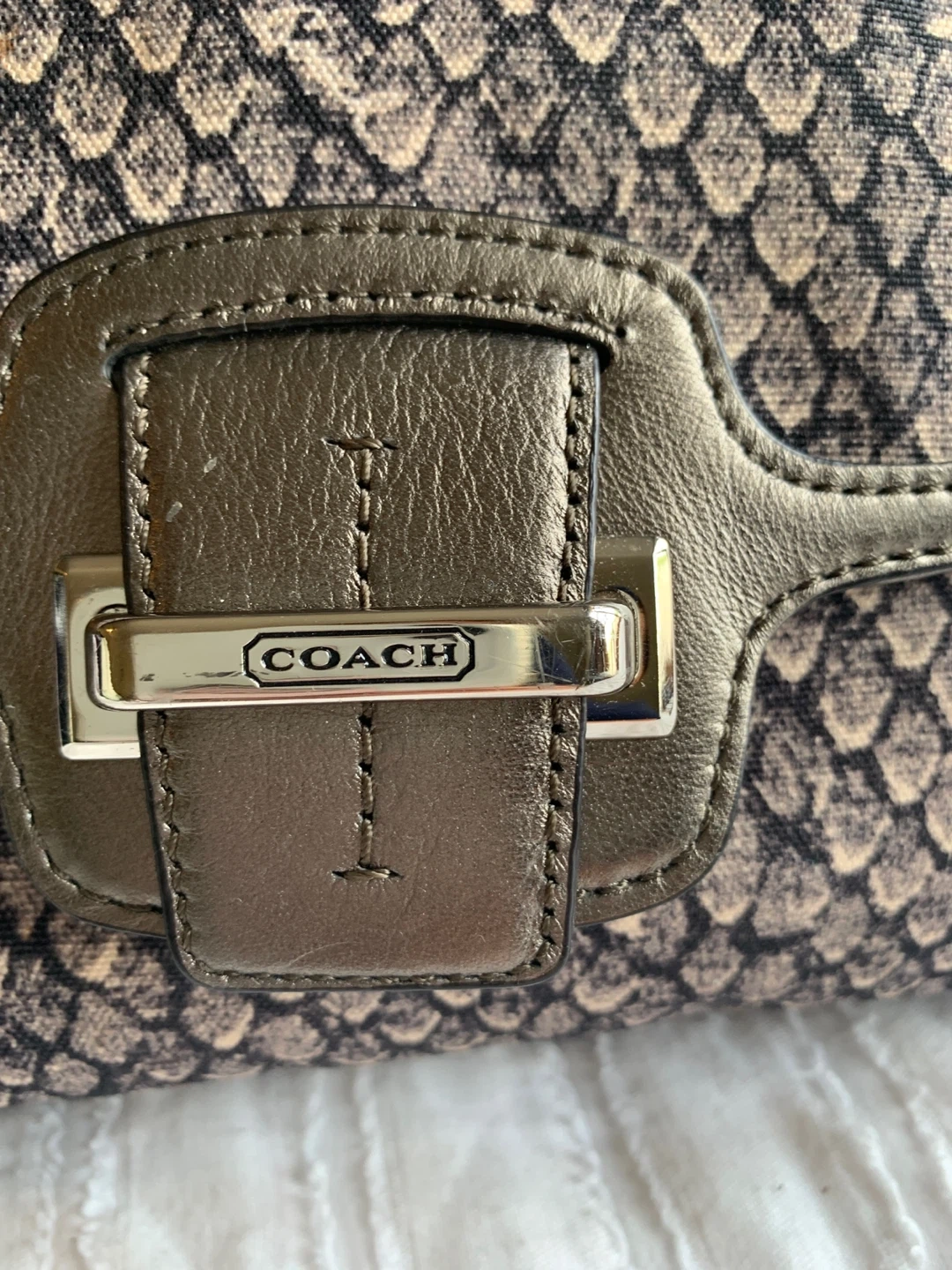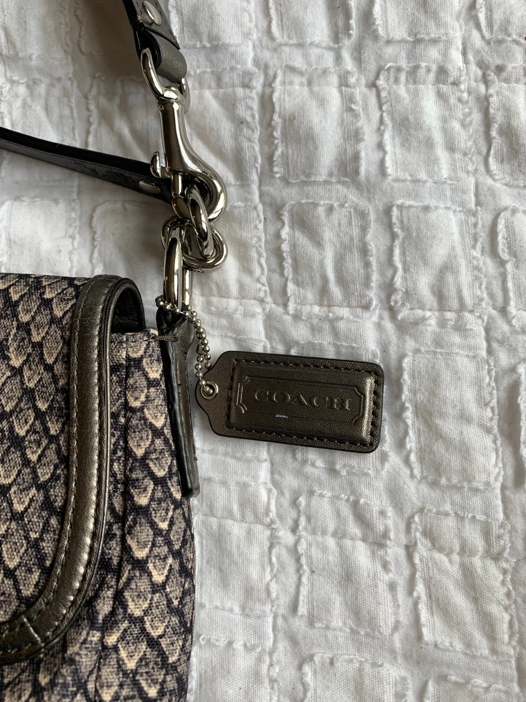 This is a Coach crossbody bag with snakeskin print and leather trim. The bag features a silver-tone Coach logo on the front. It's in great condition and ready for a new home!