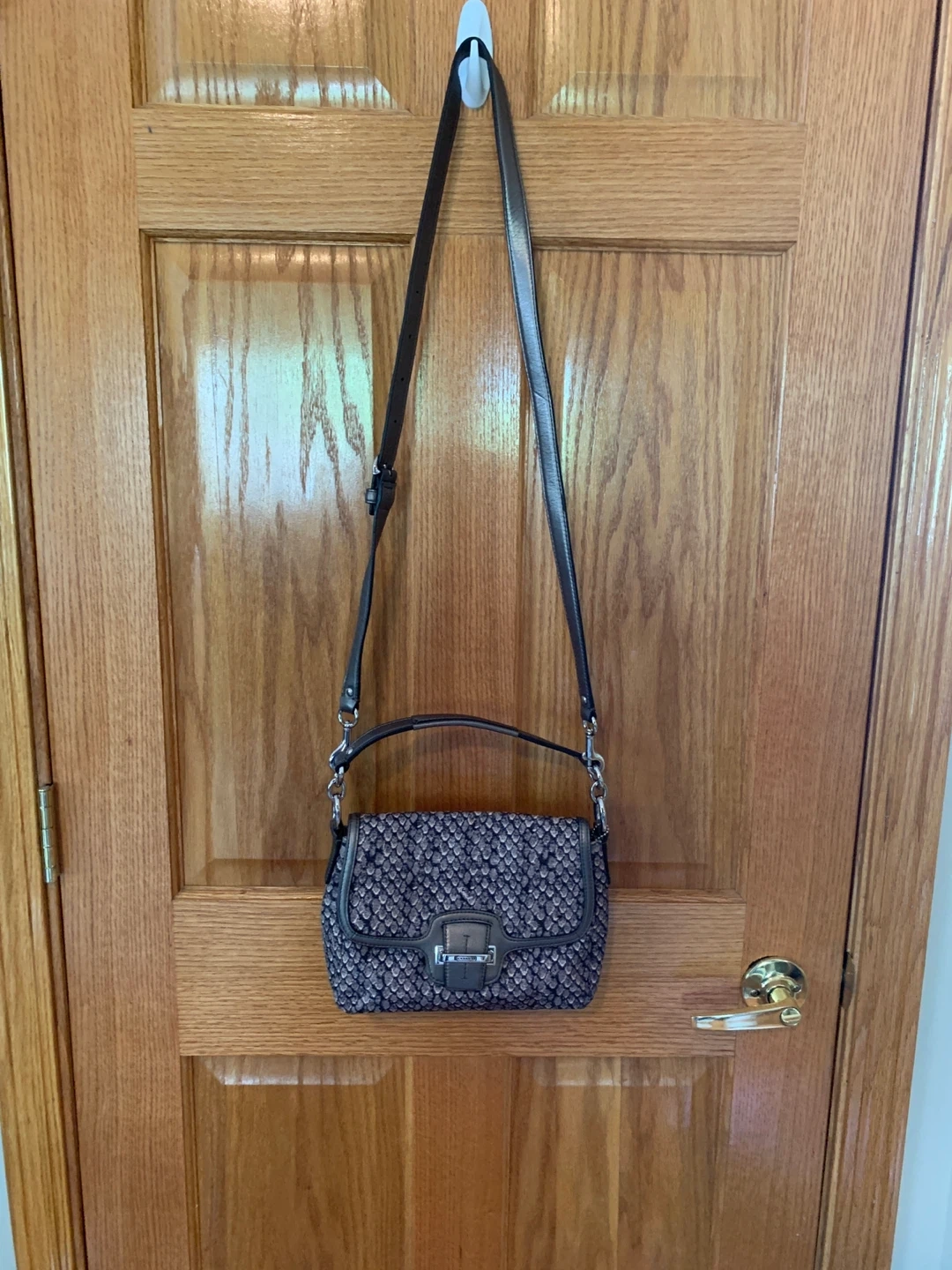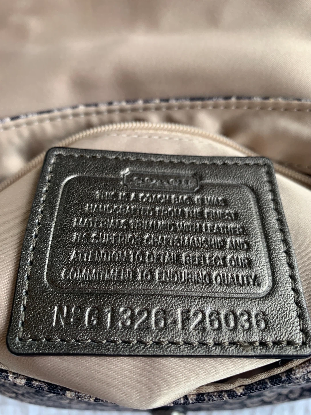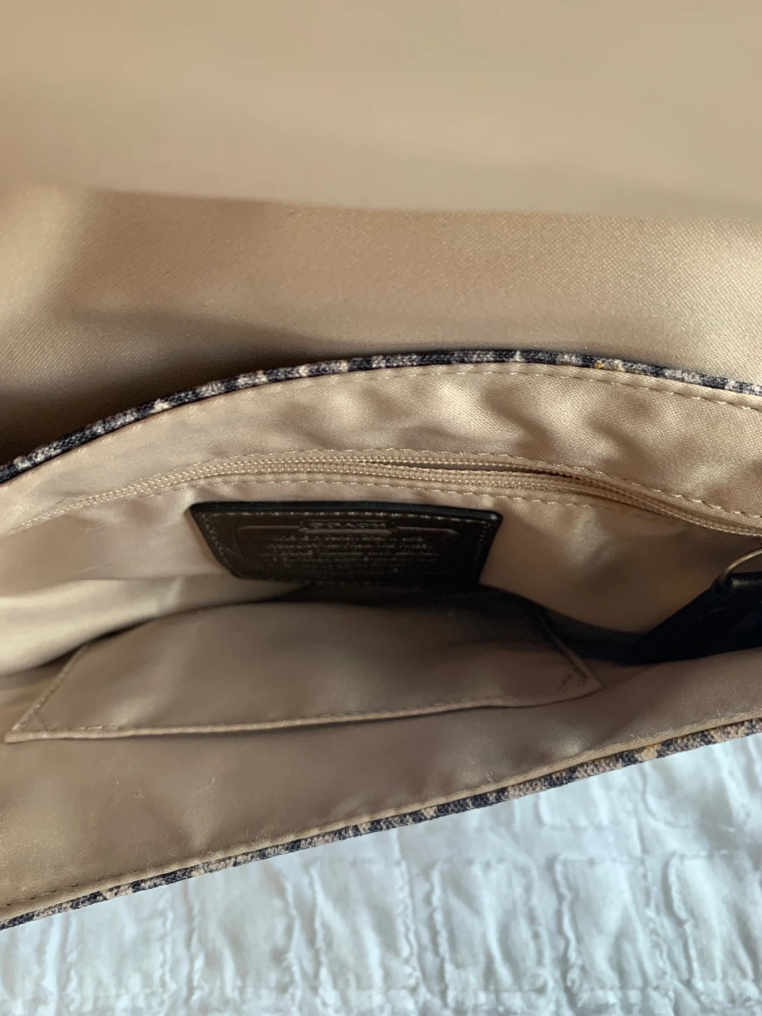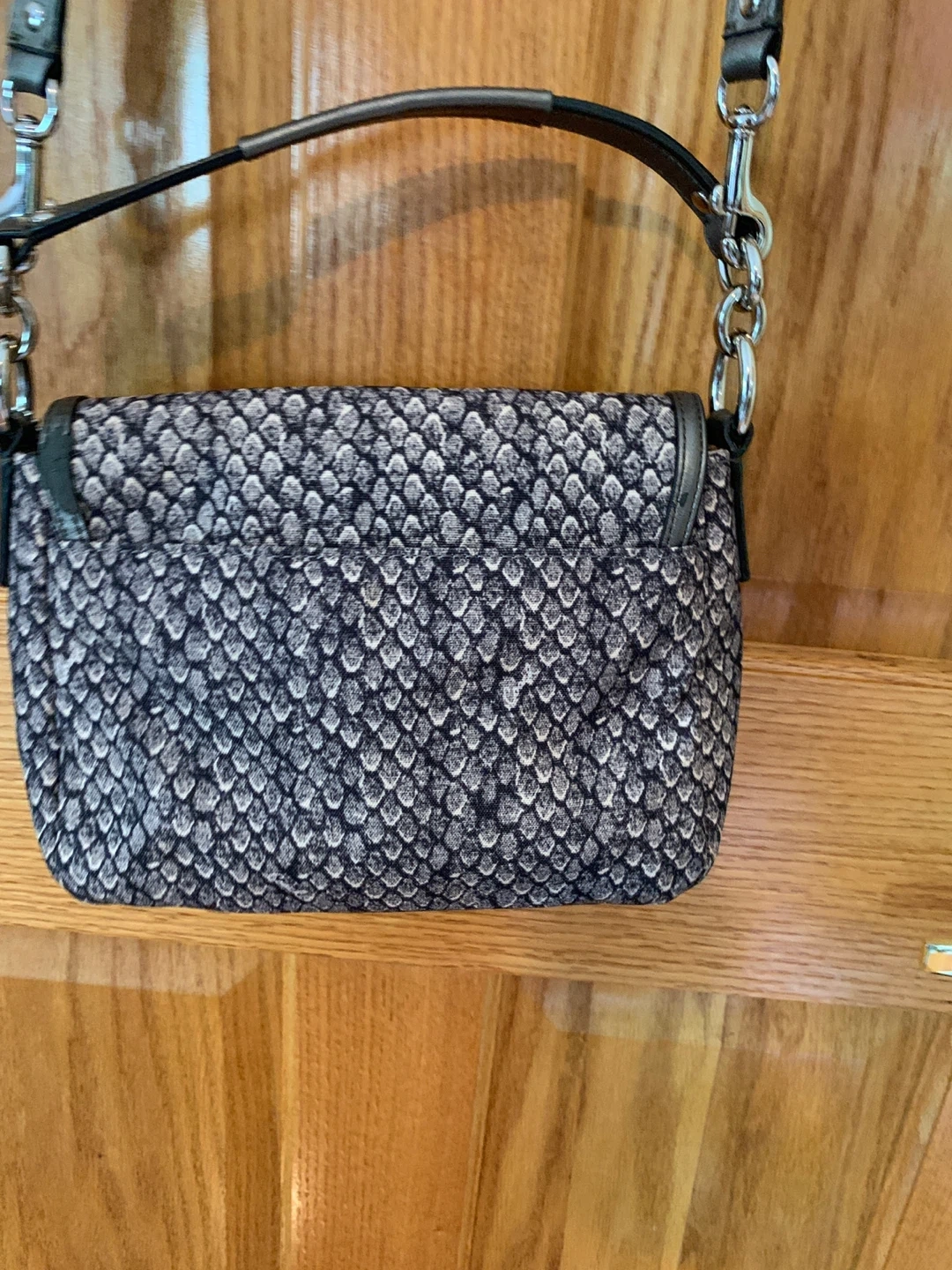 This is a Coach crossbody bag with snakeskin print and leather trim. The bag features a silver-tone Coach logo on the front. It's in great condition and ready for a new home!