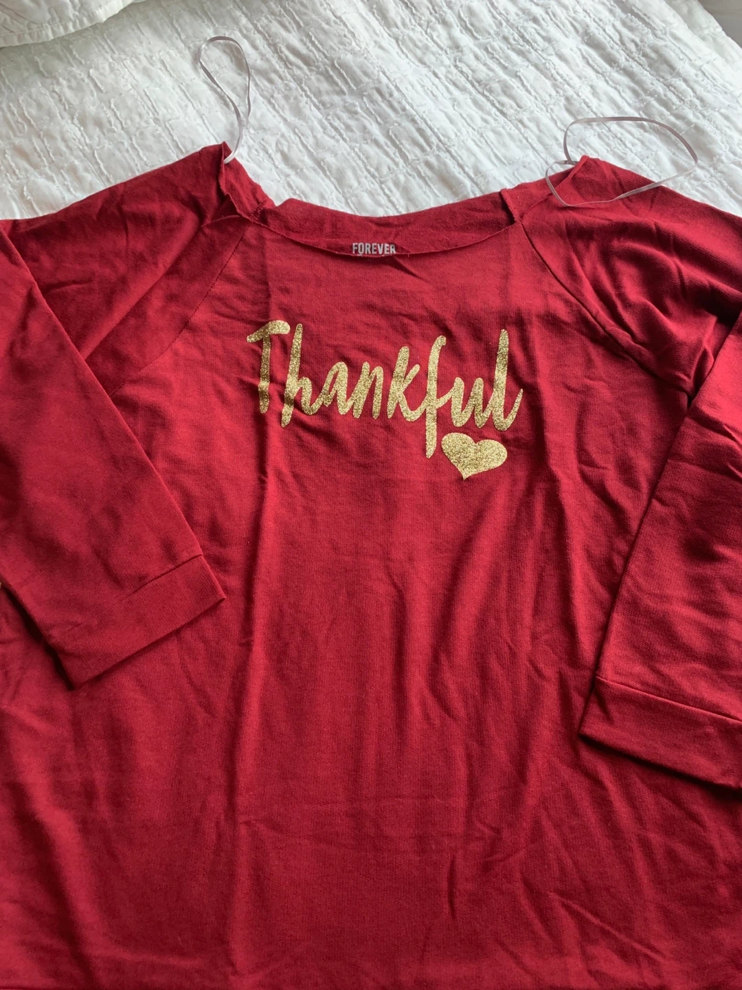 Cozy red sweatshirt from Forever Trendy! It features a cute 'Thankful' design in gold glitter, perfect for the fall season. The size is XL, and it's made of 50% cotton and 50% polyester