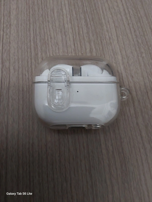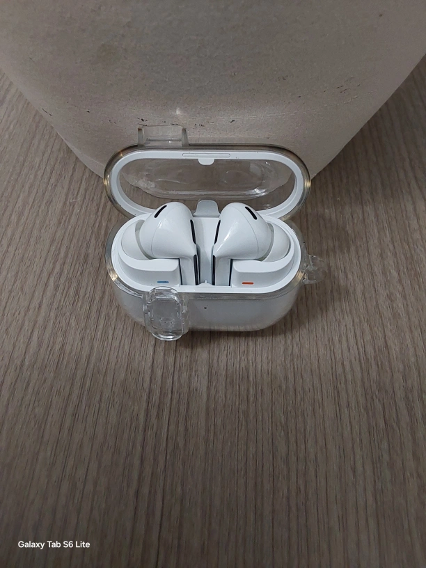 Selling a pair of white wireless earbuds. They are in great condition and come with a clear case. Perfect for listening to music or podcasts on the go