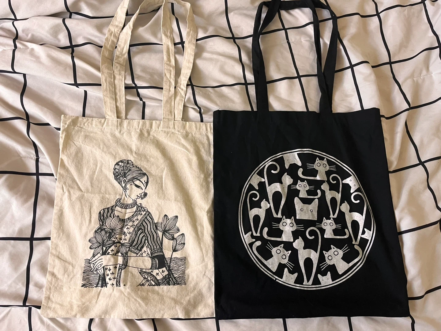 Selling two tote bags! One is cream with a woman and lotus design, and the other is black with a cute cat design. Both are in great condition and ready for a new home.
