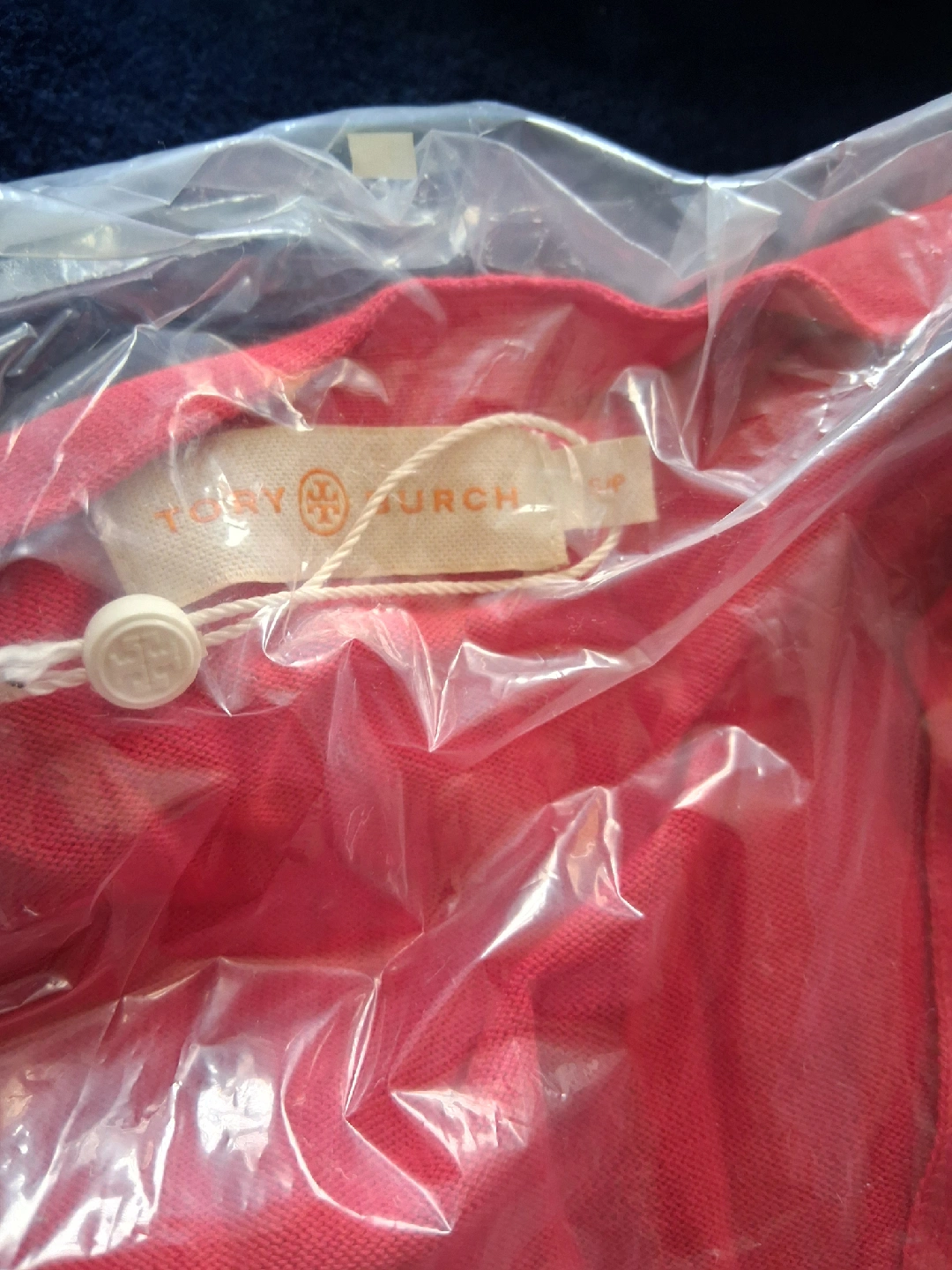 Here's a Tory Burch cardigan in a beautiful coral pink color! It's still in its original packaging and is brand new. Perfect for adding a pop of color to your wardrobe