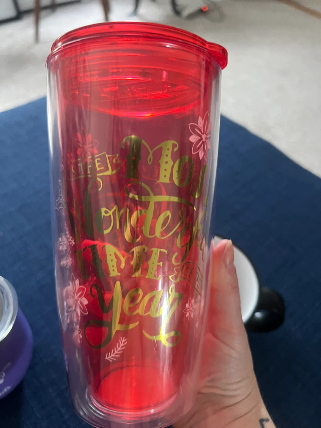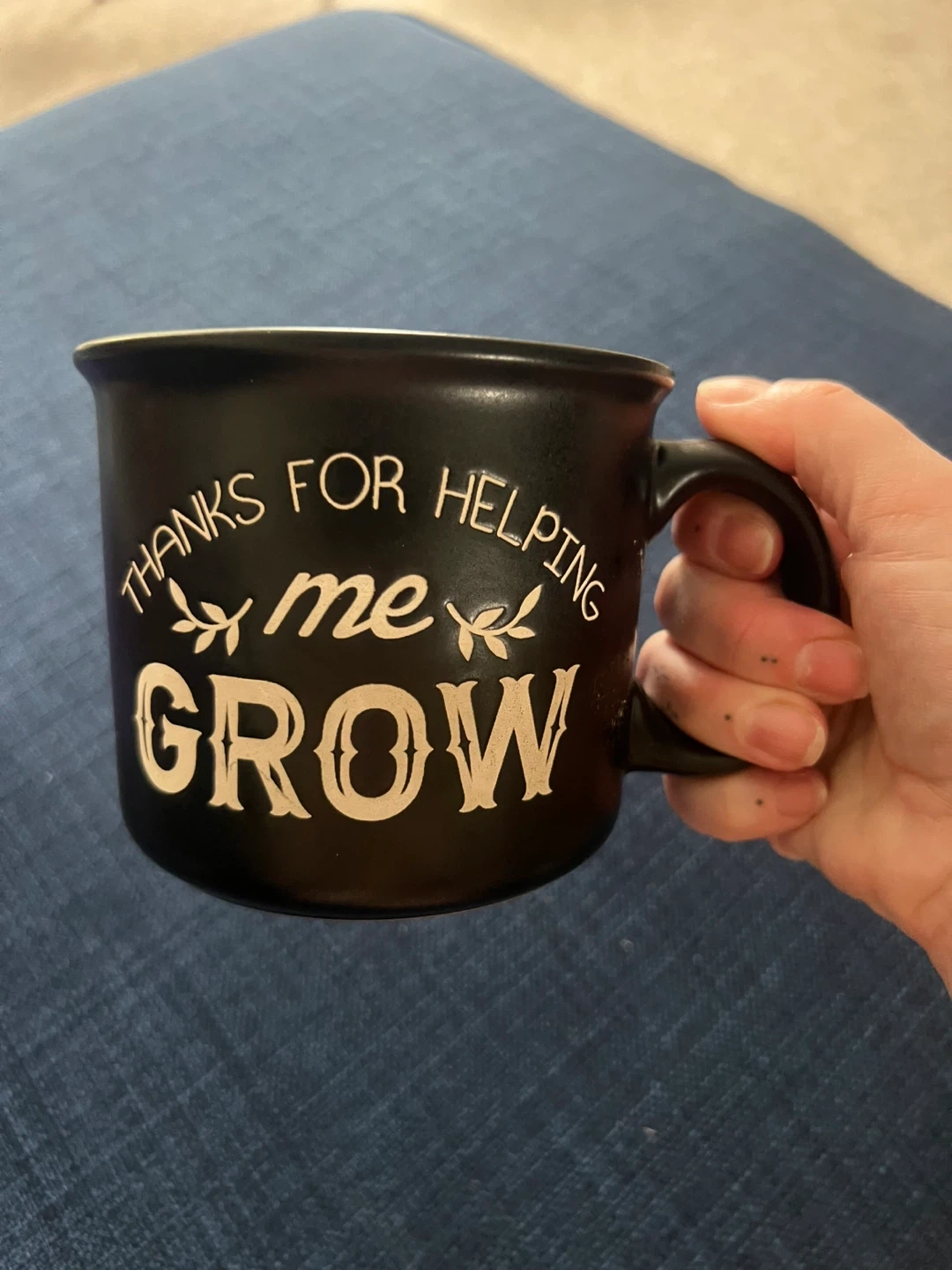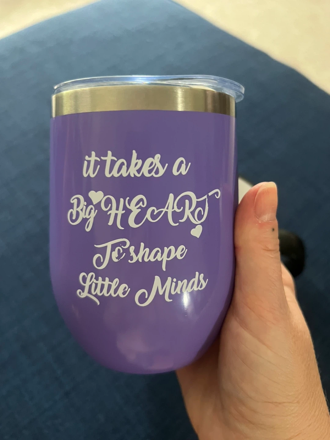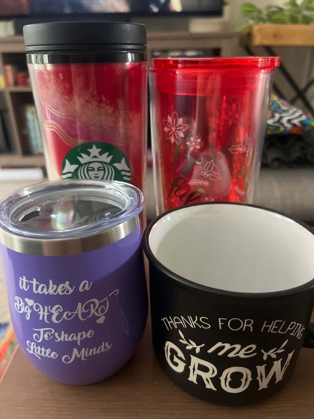 A variety of mugs and tumblers are available. One mug is black with white lettering that says, "Thanks for helping me GROW" Another is a purple tumbler with white lettering that says, "It takes a Big HEART to shape Little Minds". There are also two red tumblers. Great gifts for a teacher!