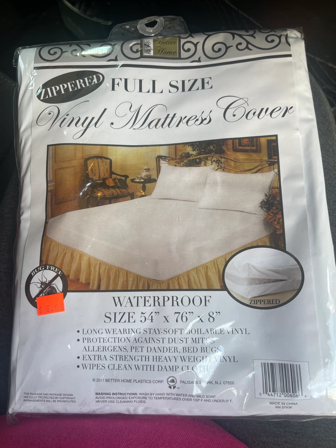I'm selling a brand new, in-package Better Home full-size vinyl mattress cover! It's waterproof and zippered, offering protection against dust mites, allergens, pet dander, and bed bugs. The cover measures 54" x 76" x 8" and is made of long-wearing, stay-soft boilable vinyl. It's easy to clean with a damp cloth too