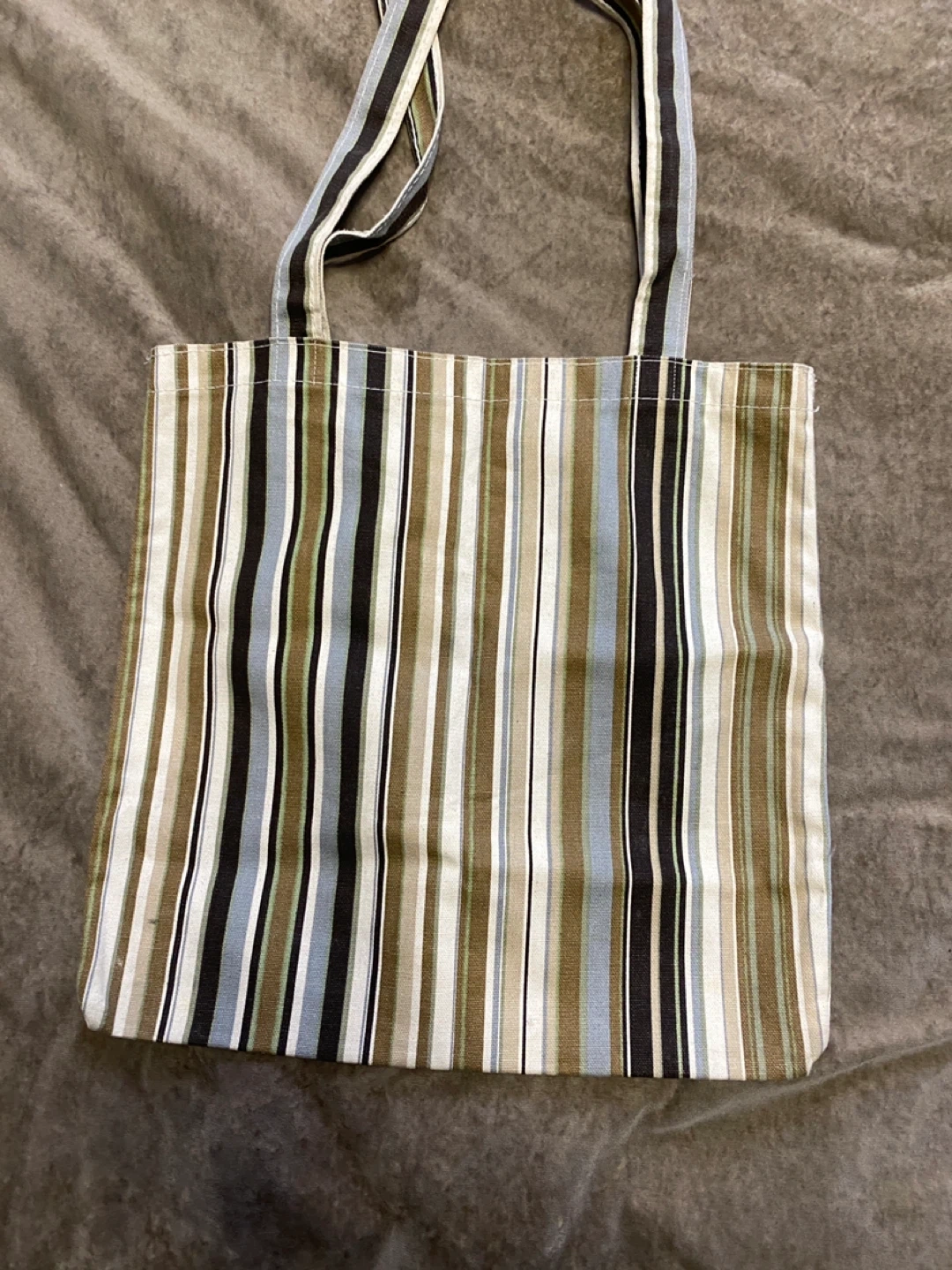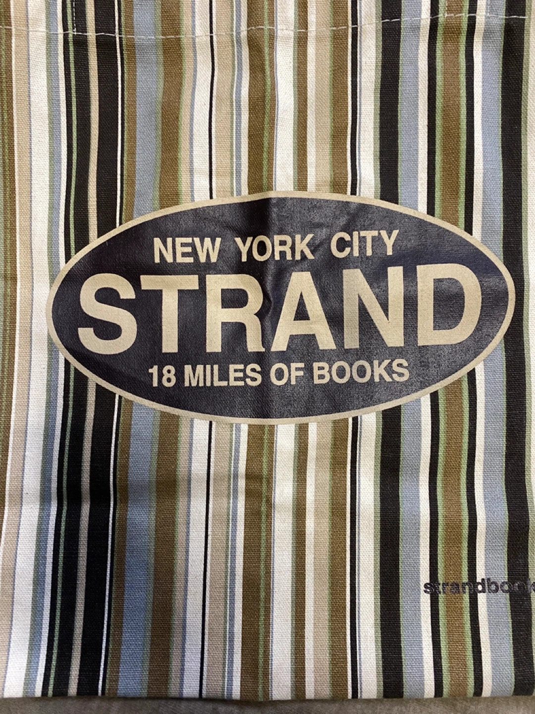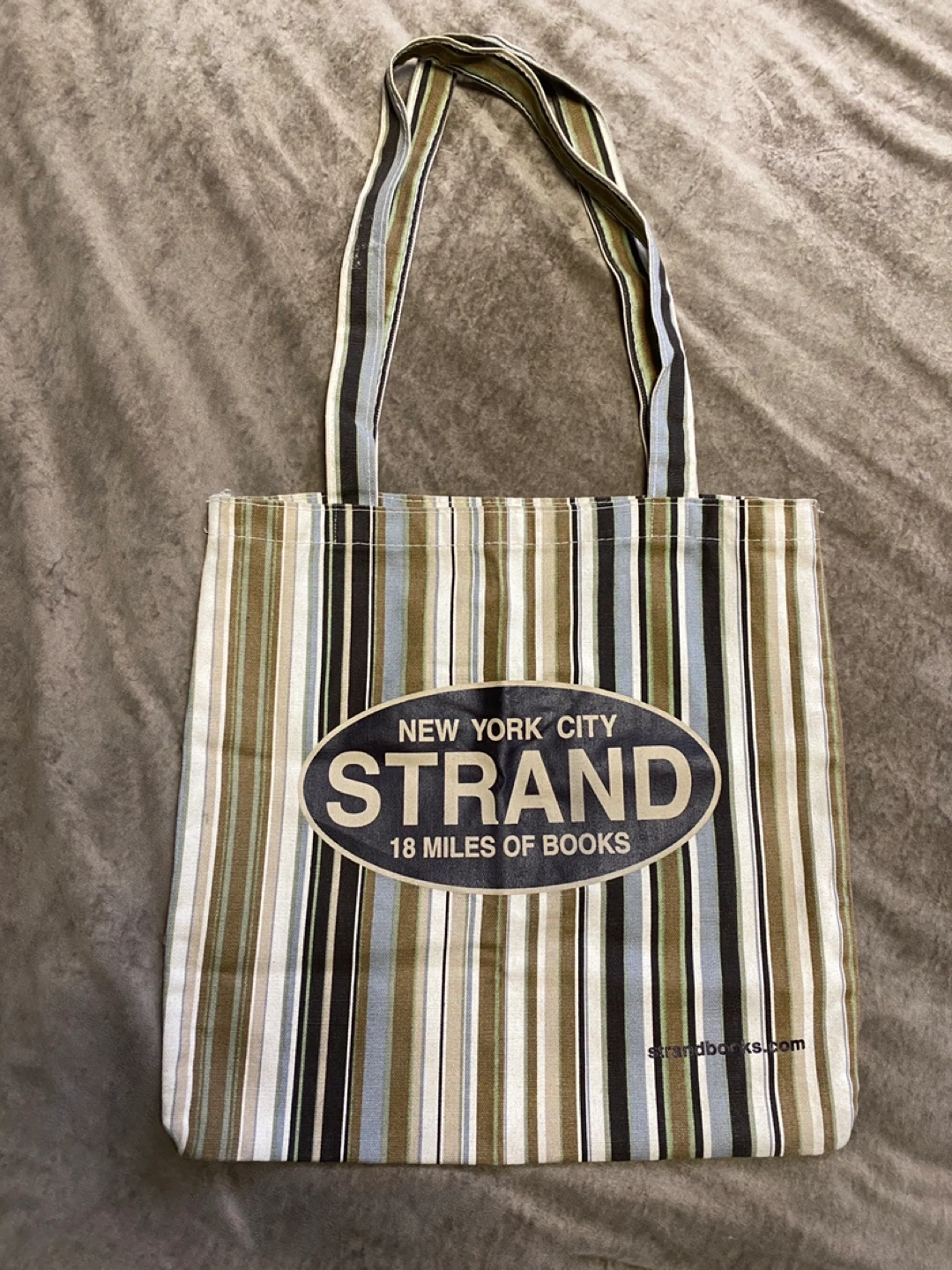 Here's a cute tote bag from the Strand Book Store in NYC! It features a striped design in brown, blue, and white. Perfect for carrying books or groceries! Lightly used. Clean and ready to use!