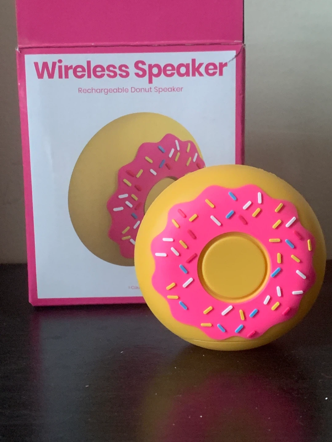 Selling a fun donut-shaped wireless speaker! It's rechargeable and super cute. - 3-hour battery life - 2W speaker output - Includes 1 Wireless Speaker and 1 Micro USB Charging Cable - Overall dimensions: Height 2.87 in (73 mm), Width 2.95 in (75 mm) Comes with the original box