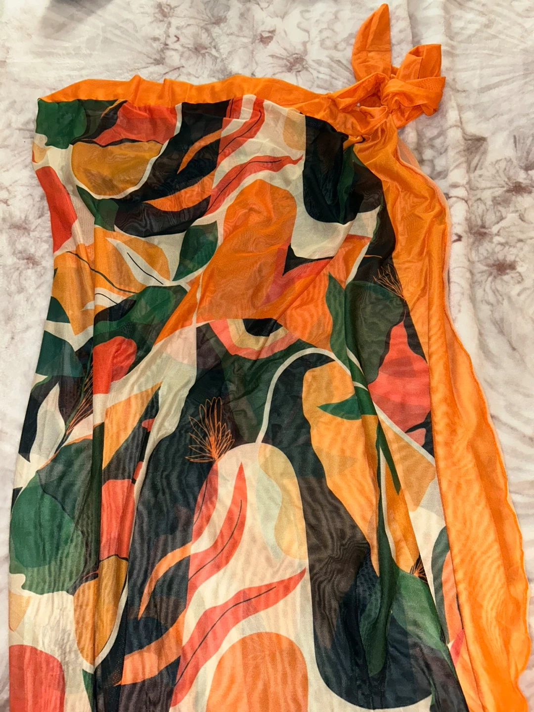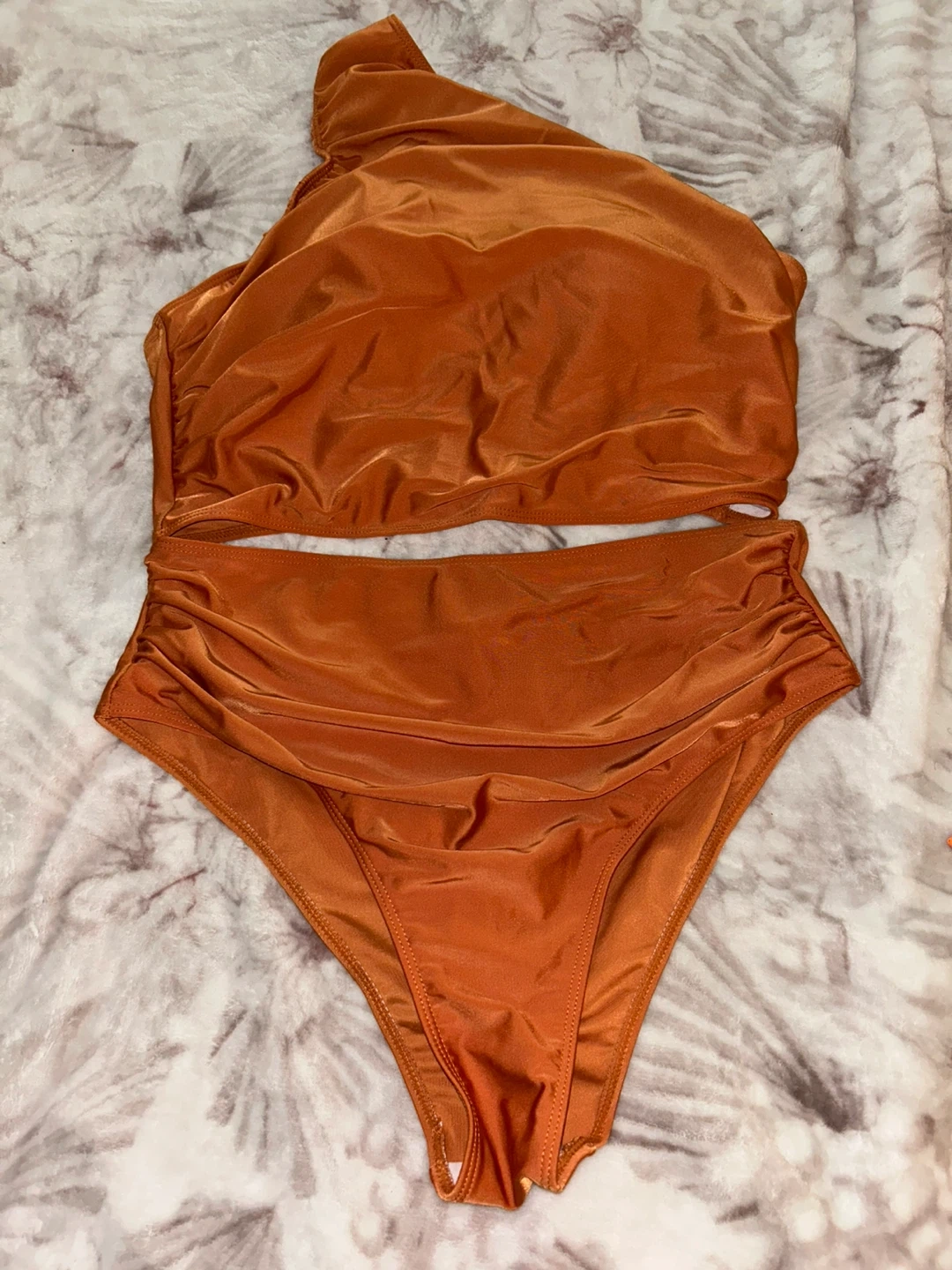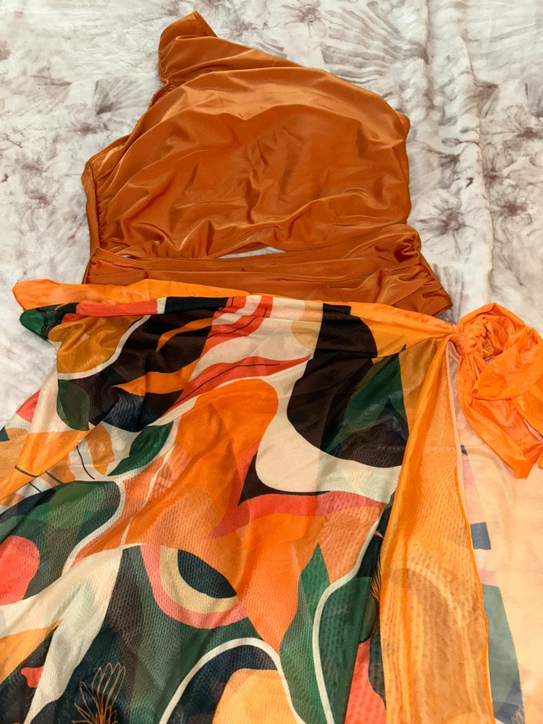 26Selling an orange one-shoulder swimsuit set. It comes with a matching sarong. The color is a beautiful, vibrant orange, perfect for summer! Never worn. Only washed.