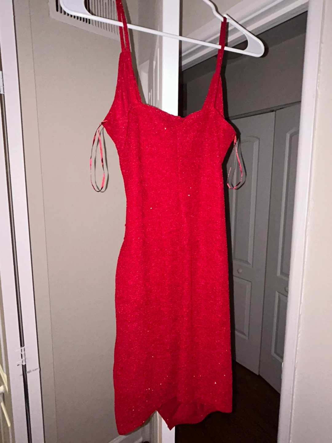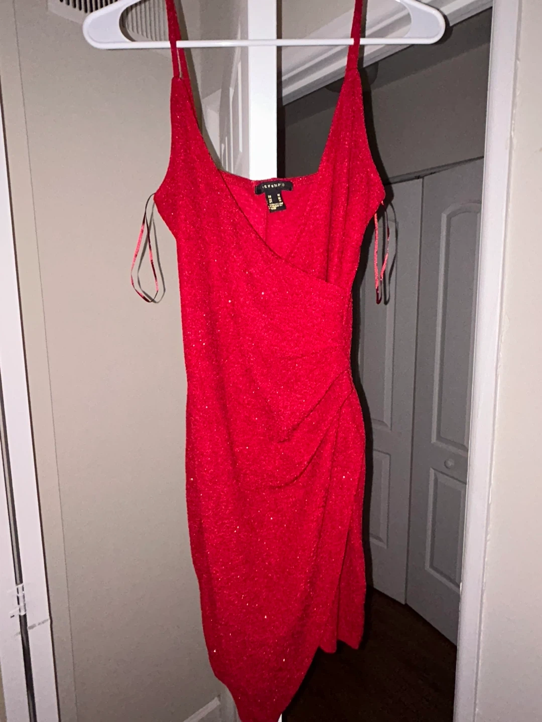 26Selling a beautiful red glitter dress from Forever 21 in size medium. It's perfect for a night out or any special occasion! The dress features a flattering wrap style and a sparkly glitter finish.