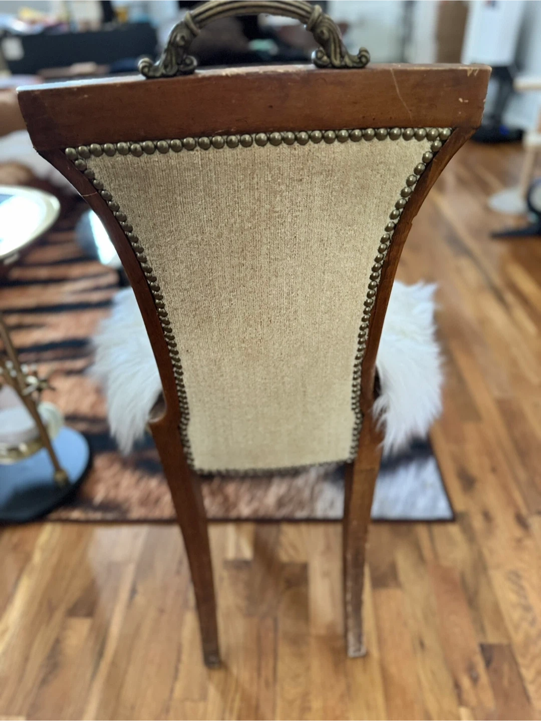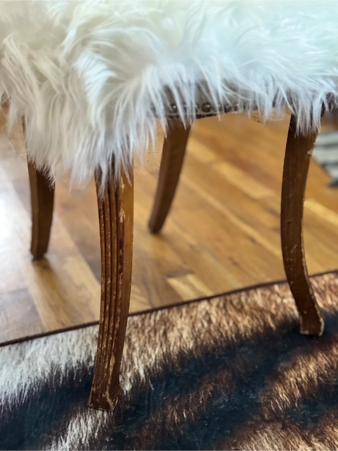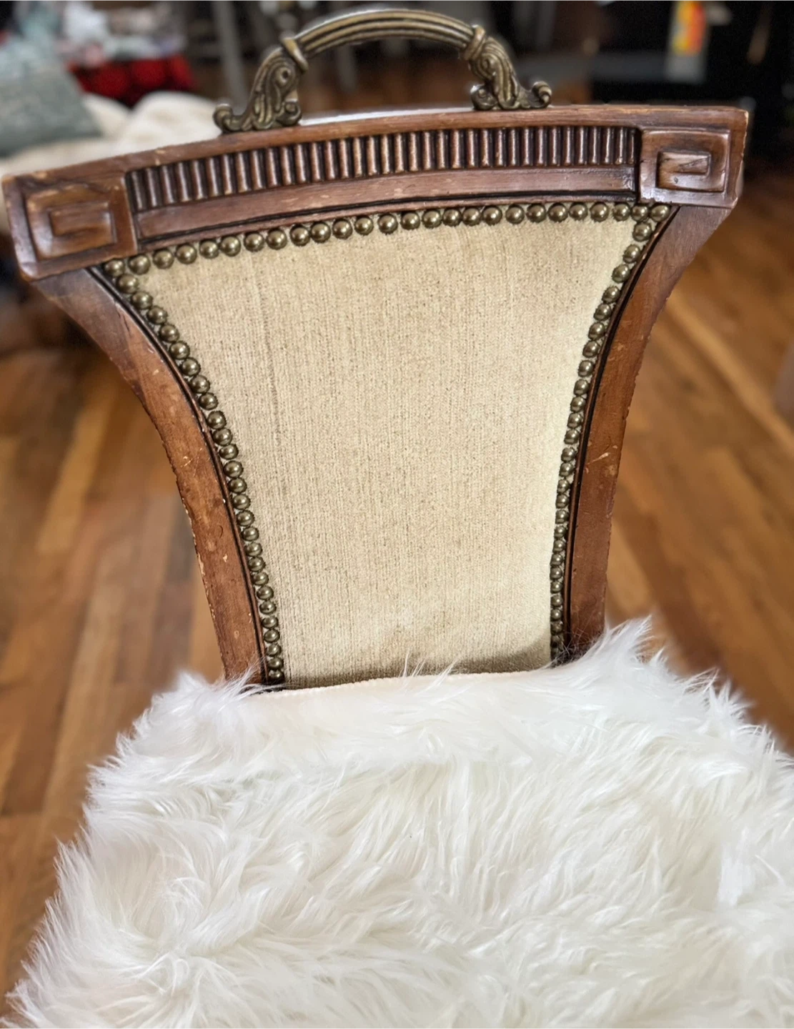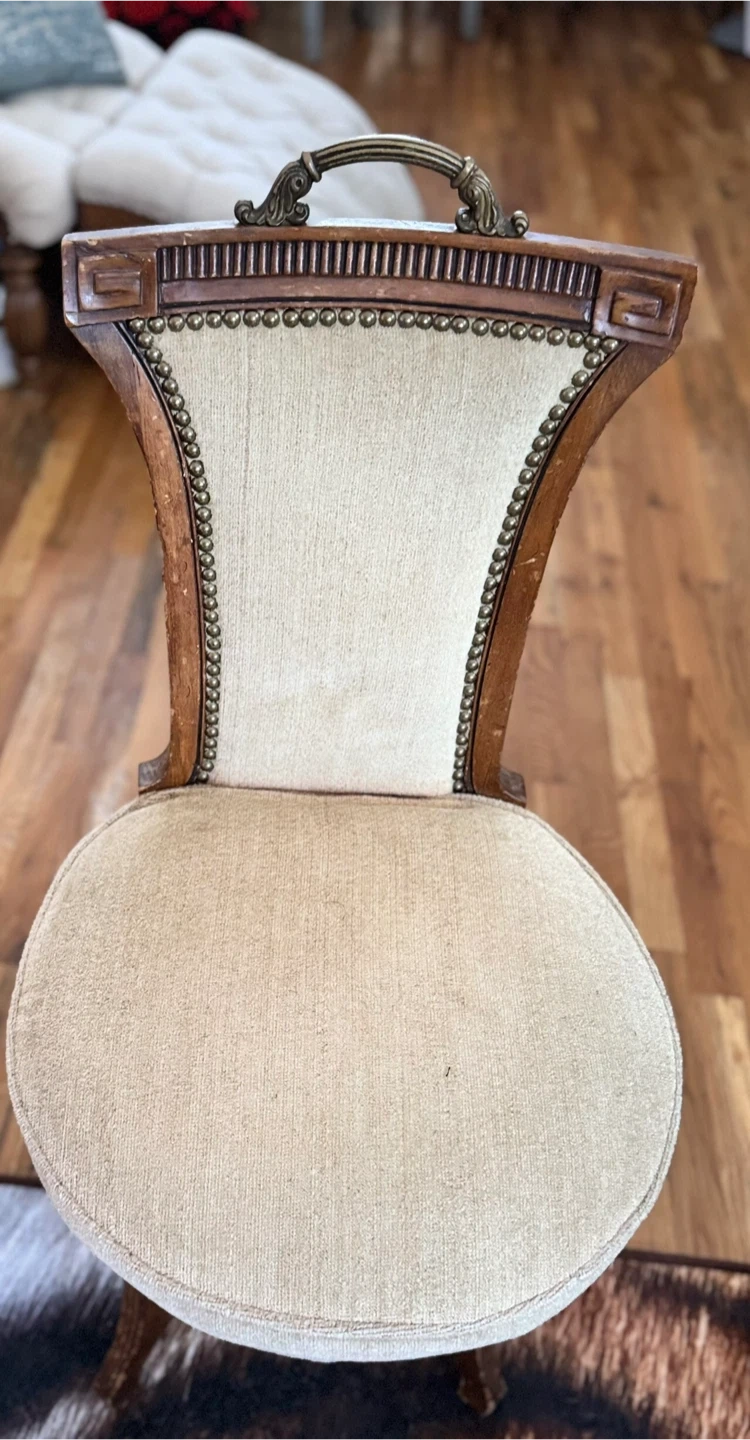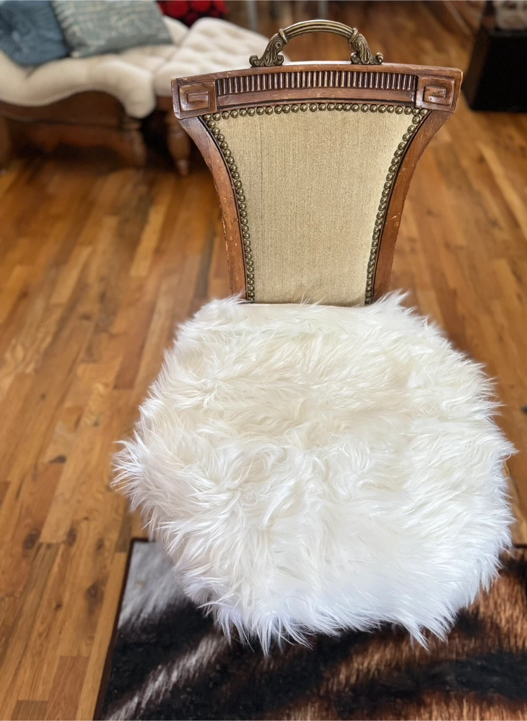 Selling a unique vintage accent chair! It has a classic design with a wooden frame and upholstered back. The chair comes with a fluffy faux fur seat cover that adds a touch of modern comfort and style. Perfect as an accent piece in any room! VINTAGE ITEMS NOTE: Please be aware that all items are used/vintage/antique and have small signs of age/patina which should be expected. We try our best to take clear photos, These are authentic vintage pieces, so various dents/dings/scratches/etc are absolutely expected. I do my best to showcase and note any notable denting, rusting, or wear that is outside this general "vintage wear" scope. If you have any questions, please do not hesitate to message us prior to purchase! Please be aware that all items are used/vintage/antique and have small signs of age/patina which should be expected. We try our best to take clear photos,
