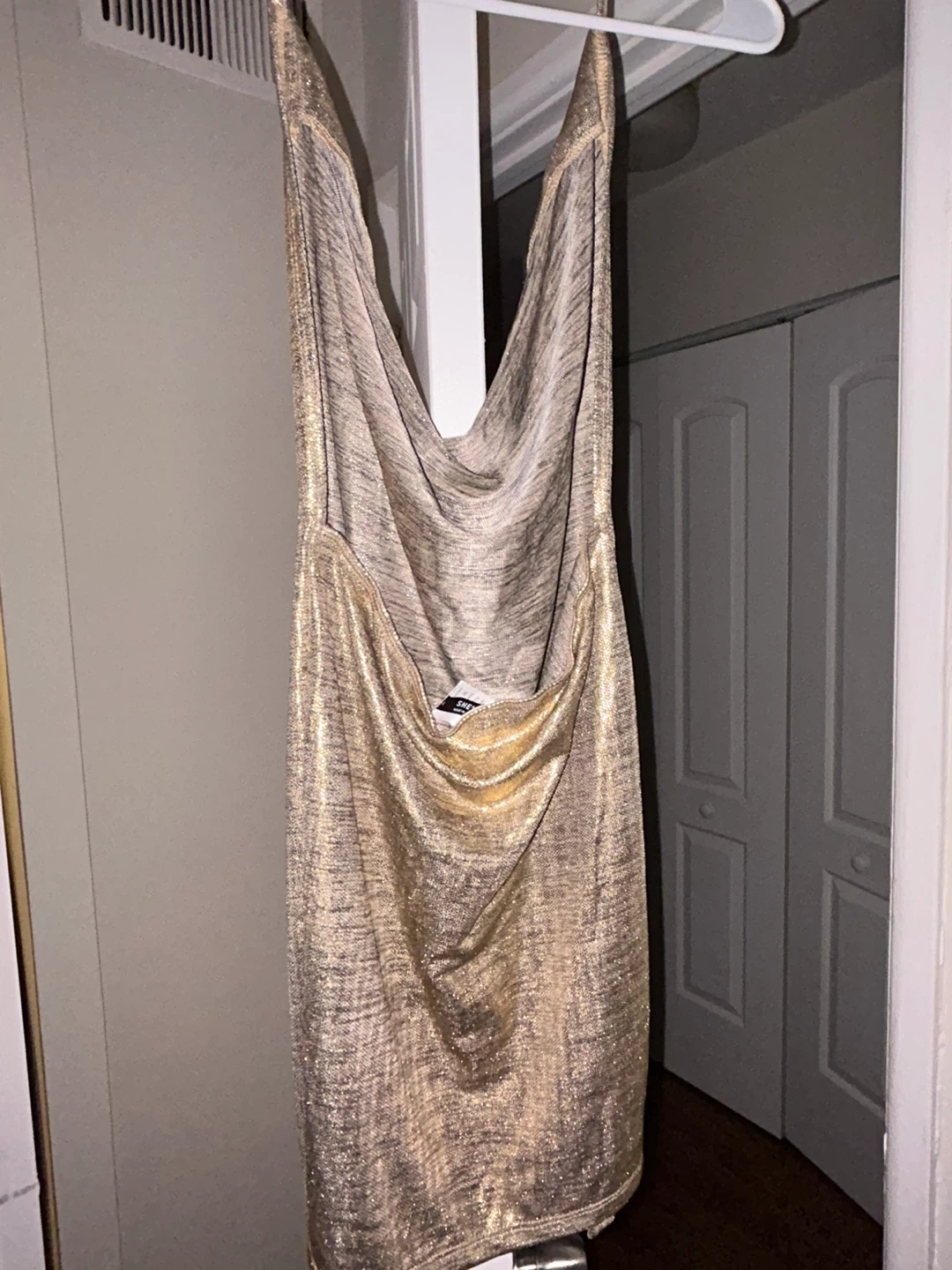 26Selling a gold dress. It's in great condition and perfect for a night out or special occasion. The dress has a cowl neck and slits on both sides, with a shimmery gold color that catches the light beautifully. It's a stylish and eye-catching piece