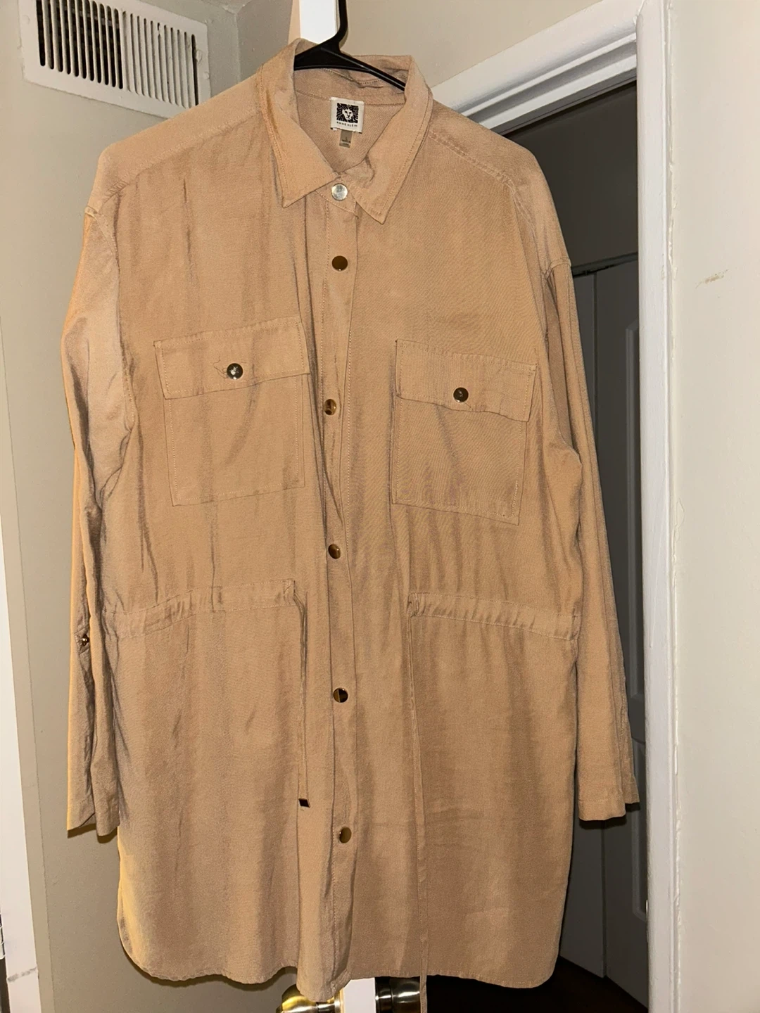 Selling a beige corduroy shirt dress from Anne Klein. It features a button-down front and chest pockets. Perfect for layering or wearing on its own!