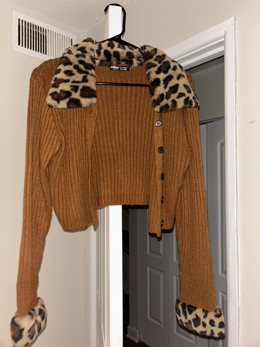 26Selling a cute cropped long sleeve button down sweater in a brown color with leopard print trim. It's a perfect piece for the fall weather, and in great condition!