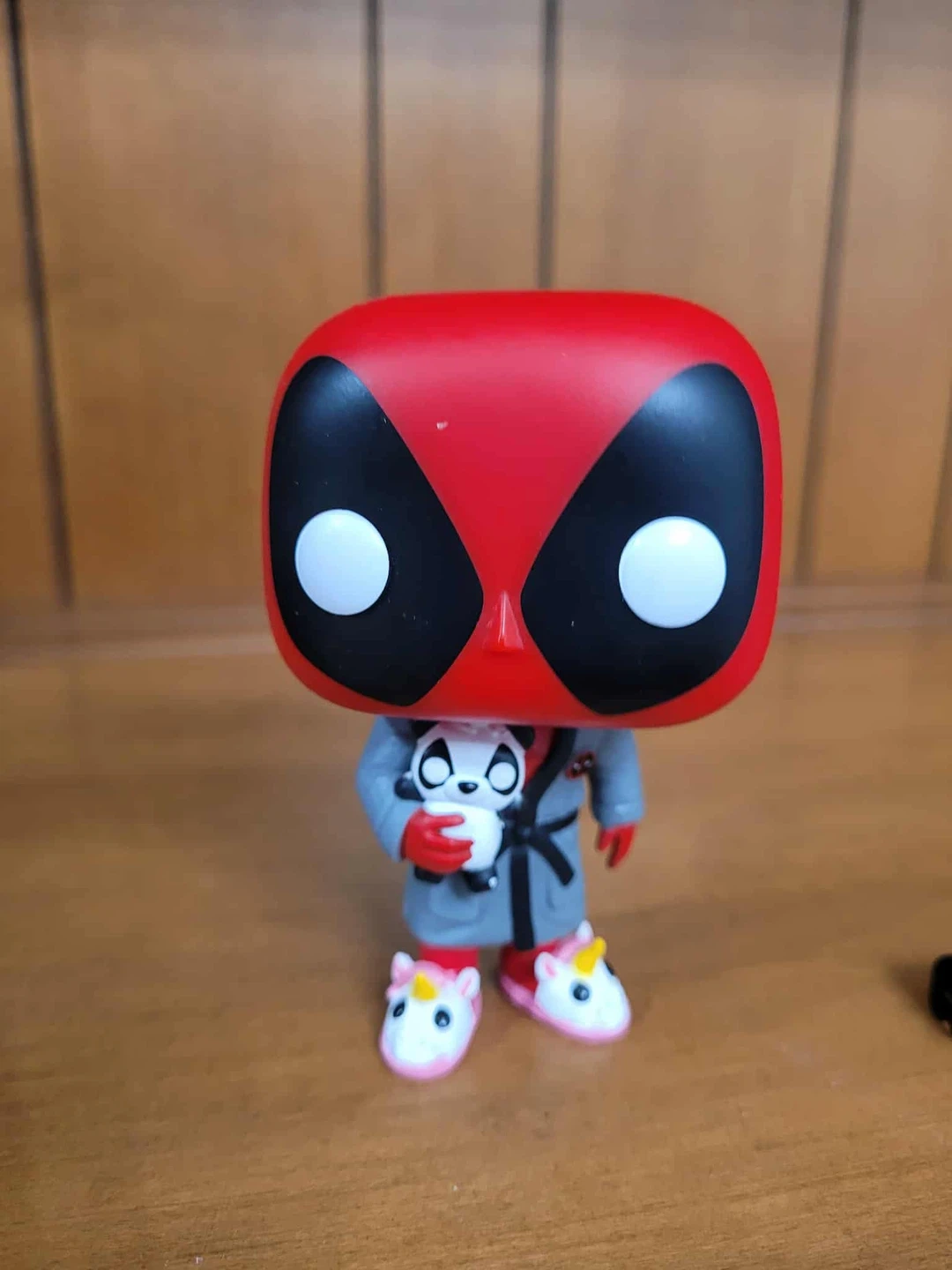 Selling a Funko Pop! figure of Deadpool in a robe holding a panda. It's in great condition and measures about 4 inches tall