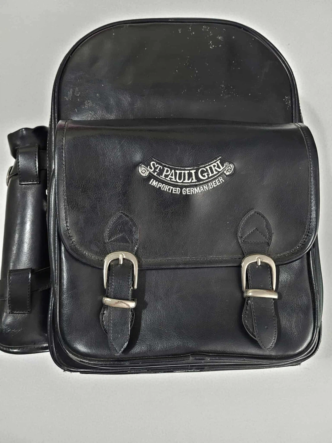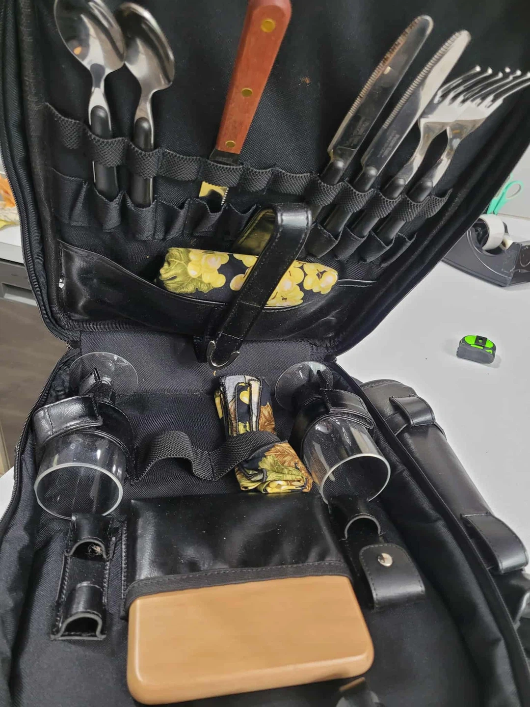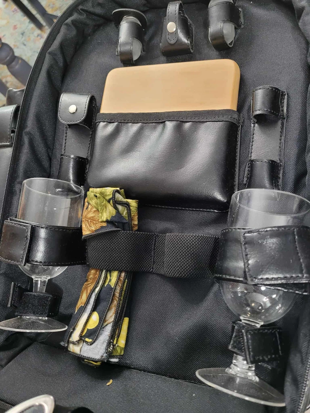 This is a Legacy Picnic Time backpack. It's black and has a few signs of wear, but it's still in good condition. It has a spot for silverware, plates, and glasses!