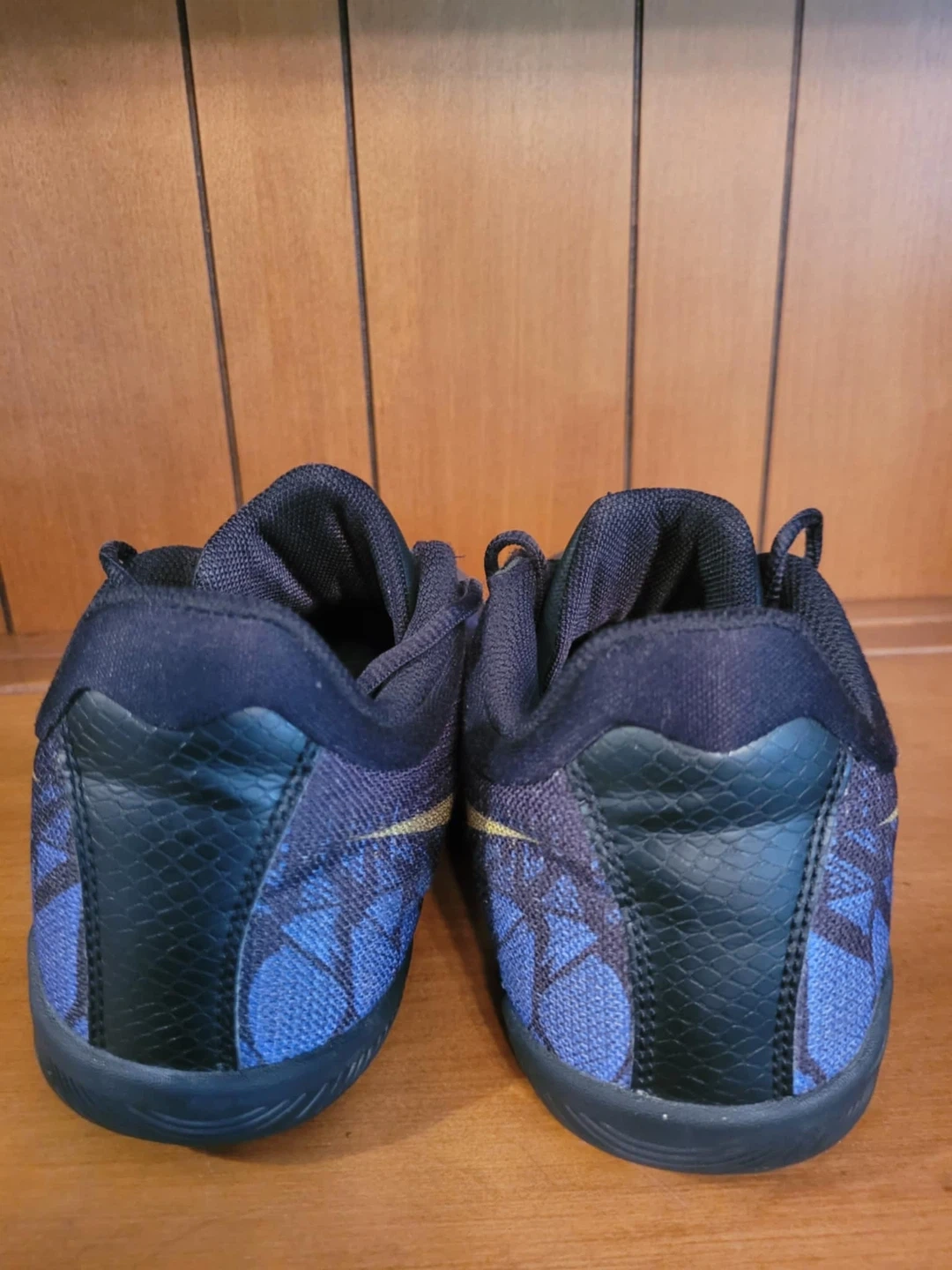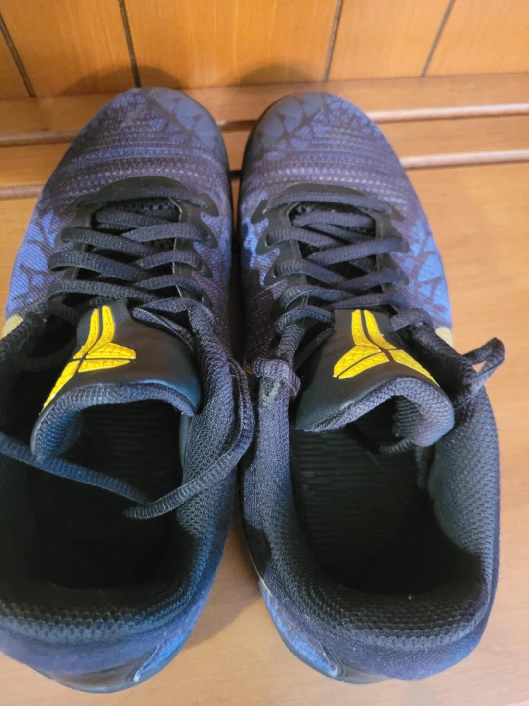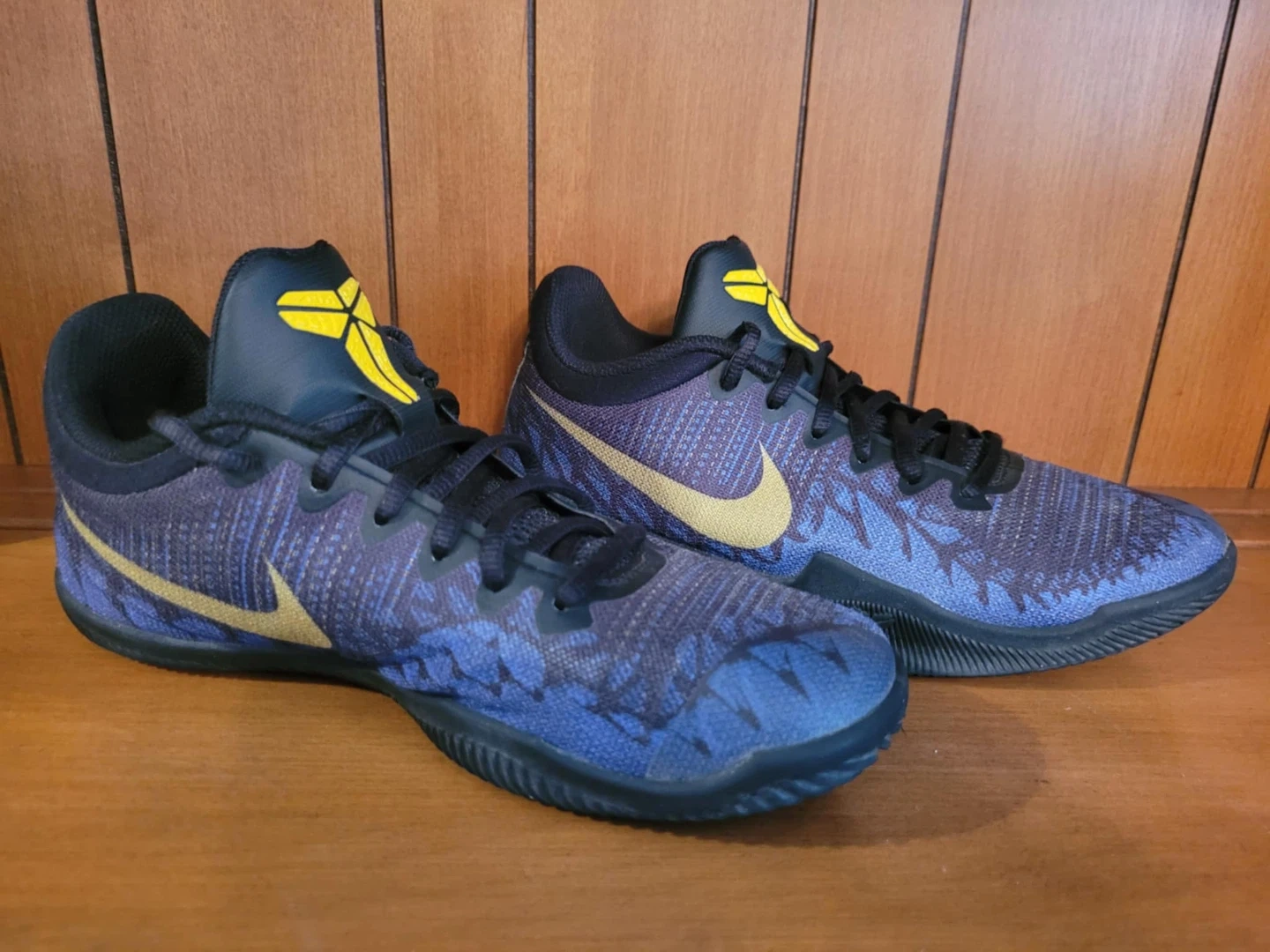 Selling a pair of Nike Kobe Mamba Rage basketball shoes. They have no size tag. See measurements The shoes feature a purple and black color scheme with gold accents, including the Nike swoosh and Kobe logo. Great for basketball or casual wear!